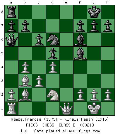 Last move : 1-0 2015 March 6 19:7:18 [Event "FICGS__CHESS__CLASS_B__000213"] [Site "FICGS"] [Date "2014.11.12"] [Round "1"] [White "Ramos,Francis"] [Black "Kirali,Hasan"] [Result "1-0"] [WhiteElo "1973"] [BlackElo "1916"] 1.e4 e5 2.Nf3 Nc6 3.Bb5 Nf6 4.O-O Nxe4 5.Re1 Nd6 6.Nxe5 Be7 7.Ba4 Nxe5 8.Rxe5 O-O 9.d4 Nc4 10.Re1 d5 11.b3 Nd6 12.Qe2 Bf6 13.Bb2 c6 14.b4 Re8 15.Qd1 Rxe1+ 16.Qxe1 Qb6 17.c3 Bf5 18.Nd2 Qa6 19.Bb3 1-0 This chess game has been lost on time (started : 2014.11.12 19:36:26) Ruy Lopez : Berlin defense, Open variation Kingside Castling by player White (move 4) Kingside Castling by player Black (move 8) Player White won this chess game. Follow this game move after move (download)Fischer sacrificed virtually everything most of us weakies (to use his term) value, respect, and cherish, for the sake of an artful, often beautiful board game, for the ambivalent privilege of being its greatest master. (Paul Kollar) Es ist im Leben wie im Schachspiel. Wir entwerfen einen Plan, dieser bleibt jedoch bedingt durch das, was im Schachspiel dem Gegner, im Leben dem Schicksal zu tun belieben wird. (Arthur Schopenhauer) El Ajedrez es la vida. (Bobby Fischer) La vie est comme un jeu d'échecs : nous esquissons un plan, mais celui-ci est tributaire de ce que daignent faire l'adversaire aux échecs et le destin dans la vie. (Arthur Schopenhauer) A belief is an idea the mind possesses, an idea that possesses the mind. (Robert Oxden Bolton)