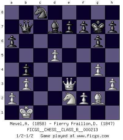 Last move : 1/2-1/2 2015 May 18 21:43:37 [Event "FICGS__CHESS__CLASS_B__000213"] [Site "FICGS"] [Date "2014.11.12"] [Round "1"] [White "Mevel,Alberic"] [Black "Fierry Fraillon,David"] [Result "1/2-1/2"] [WhiteElo "1858"] [BlackElo "1847"] 1.e4 c5 2.Nf3 d6 3.d4 cxd4 4.Nxd4 Nf6 5.Nc3 a6 6.h3 g6 7.g4 Bg7 8.Bg2 O-O 9.Be3 Nc6 10.Qd2 Nd7 11.O-O-O Nb6 12.b3 Bd7 13.Kb1 Qc7 14.Nde2 Rfc8 15.Nd5 Nxd5 16.exd5 Na7 17.c4 Qd8 18.Rc1 b5 19.c5 dxc5 20.Rxc5 b4 21.Rxc8 Qxc8 22.Rc1 Qb7 23.Bd4 Rc8 24.Rxc8+ Nxc8 25.Bxg7 Kxg7 26.Qe3 1/2-1/2 Sicilian : Najdorf, Adams attack Kingside Castling by player Black (move 8) Queenside Castling by player White (move 11) This chess game ended in a draw. Follow this game move after move (download)The most powerful weapon in Chess is to have the next move. (David Bronstein) Nach Morphy wurde nichts neues mehr in der Behandlung offener Positionen gefunden. (Mikhail Moiseyevich Botvinik) El Ajedrez es un expediente tonto que hace creer a la gente inactiva que hacen una cosa muy astuta cuando solamente estan perdiendo su tiempo. (George Bernard Shaw) Vous m'avez demandé de vous exposer quel est le fondement de la prière. Je ne fais que préparer les pièces du jeu sur la table... Nous sera-t-il permis d'en adopter les règles et si nous les appliquons scrupuleusement nous ne tarderons pas à faire mat le Roi divin ! Il ne pourra échapper à nos mains. (Sainte Thérèse d'Avila, Chemin de perfection) The obstacle is the path. (Zen proverb)