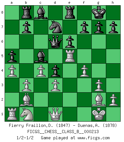 Last move : 1/2-1/2 2015 January 13 11:4:26 [Event "FICGS__CHESS__CLASS_B__000213"] [Site "FICGS"] [Date "2014.11.12"] [Round "1"] [White "Fierry Fraillon,David"] [Black "Duenas,Alexis"] [Result "1/2-1/2"] [WhiteElo "1847"] [BlackElo "1878"] 1.c4 e6 2.Nf3 d5 3.g3 Nf6 4.Bg2 Be7 5.O-O O-O 6.b3 c5 7.Bb2 Nc6 8.e3 d4 9.exd4 cxd4 10.Re1 Re8 11.d3 Bc5 12.a3 a5 13.Ne5 Nxe5 14.Rxe5 Qd6 15.f4 Rb8 16.a4 Nd7 17.Re2 Nf6 18.Re5 Nd7 1/2-1/2 English : Neo-Catalan declined Kingside Castling by player White (move 5) Kingside Castling by player Black (move 5) This chess game ended in a draw. Follow this game move after move (download)Chess is a forcing house where the fruits of character can ripen more fully than in life. (Edward Morgan Foster) Über Karpov: Er war und ist ein Vertreter der russischen Reaktionäre. Das steckt tief in seiner Seele, wehalb ich nicht nett mit ihm umgehen kann. (Viktor Kortschnoi) ¿Porque tengo que perder ante este idiota?. (Aron Nimzovich) Le pion, dans sa simplicité, marche droit devant lui, mais lorsqu'il prend, il le fait obliquement? Ainsi l'homme, tant qu'il reste pauvre, marche dans la droiture et vit honnêtement, mais lorsqu'il recherche les honneurs, il flatte, se parjure et, par les voies obliques, cherche une position supérieure sur l'échiquier du monde. (Jean de Galles) When I took office, only high energy physicists had ever heard of what is called the World Wide Web... Now even my cat has its own page. (Bill Clinton, 1996)