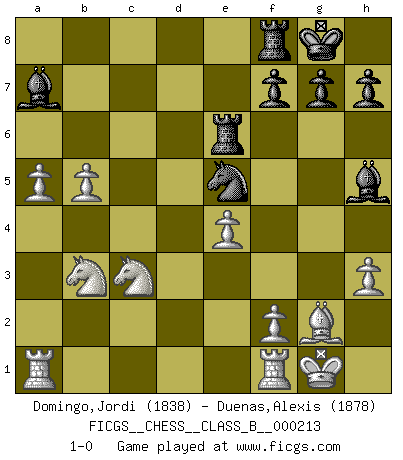 Last move : 1-0 2015 March 5 18:52:30 [Event "FICGS__CHESS__CLASS_B__000213"] [Site "FICGS"] [Date "2014.11.12"] [Round "1"] [White "Domingo,Jordi"] [Black "Duenas,Alexis"] [Result "1-0"] [WhiteElo "1838"] [BlackElo "1878"] 1.g4 d5 2.Bg2 Bxg4 3.c4 c6 4.Qb3 Nf6 5.Qxb7 Nbd7 6.d4 e5 7.h3 Bf5 8.cxd5 cxd5 9.Nc3 Rb8 10.Qxa7 Bb4 11.Bd2 O-O 12.Nf3 Ne4 13.O-O Nxd2 14.Nxd2 Qc8 15.Nxd5 Qd8 16.e4 Bg6 17.Nb3 Ra8 18.Qc7 Qxc7 19.Nxc7 Ra4 20.a3 Bd6 21.Nb5 Be7 22.dxe5 Nxe5 23.N3d4 Bd8 24.b4 Bb6 25.Nc3 Ra6 26.Nb3 Ba7 27.b5 Re6 28.a4 Bh5 29.a5 1-0 Grob : Fritz gambit Kingside Castling by player Black (move 11) Kingside Castling by player White (move 13) Player White won this chess game. Follow this game move after move (download)Bobby Fischer is the greatest Chess player who has ever lived. (Ken Smith) Es gibt Leute, die glauben, alles wäre vernünftig, was man mit einem ernsthaften Gesicht tut. (Georg Christoph Lichtenberg) ¿Quién es tu oponente esta tarde? Esta tarde mi oponente son las piezas negras. (Akiba Rubinstein) Les Echecs ont trois composantes : le temps, l'espace et le matériel en dernier. (Mikhail Tal) Luck never made a man wise. (Seneca, Letters to Lucilius)