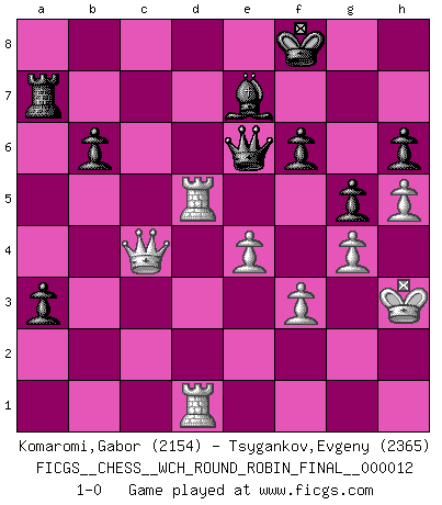 Last move : 1-0 2015 March 8 16:28:43 [Event "FICGS__CHESS__WCH_ROUND_ROBIN_FINAL__000012"] [Site "FICGS"] [Date "2014.11.14"] [Round "1"] [White "Komaromi,Gabor"] [Black "Tsygankov,Evgeny"] [Result "1-0"] [WhiteElo "2154"] [BlackElo "2365"] 1.d4 Nf6 2.c4 g6 3.Nf3 Bg7 4.Nc3 d5 5.cxd5 Nxd5 6.e4 Nxc3 7.bxc3 c5 8.Rb1 O-O 9.Be2 cxd4 10.cxd4 Qa5+ 11.Bd2 Qxa2 12.O-O Bg4 13.Be3 Nc6 14.d5 Na5 15.Bg5 b6 16.Bxe7 Rfe8 17.d6 Nc6 18.Bb5 Nxe7 19.Bxe8 Rxe8 20.dxe7 Qa3 21.Re1 Qxe7 22.h3 Bxf3 23.Qxf3 Bd4 24.Rbd1 Qe5 25.Rd3 a5 26.Red1 Bc5 27.Rd7 Re7 28.R7d5 Qe6 29.Qc3 f6 30.Kh2 a4 31.f3 a3 32.g4 Rb7 33.h4 Bf8 34.Rb1 h6 35.Qc4 Kh8 36.Kh3 Kg7 37.Qa6 Qc6 38.Qa8 Be7 39.h5 g5 40.Qa6 Kf8 41.Qd3 Ra7 42.Qe3 Bc5 43.Qb3 Qe6 44.Rbd1 Be7 45.Qc4 1-0 King's Indian, 3.Nf3 Kingside Castling by player Black (move 8) Kingside Castling by player White (move 12) Player White won this chess game. Follow this game move after move (download)War is the child of passion, passion is the child of narcissism and narcissism is the child. (...) Another game ? (Thibault de Vassal) Wenn Spassky eine Figur opfert kannst du genauso gut aufgeben. Aber wenn Tal eine Figur opfert, spiel weiter. Er könnte noch eine weitere opfern, und dann ... wer weiß? (Miguel Najdorf) El Ajedrez hace al hombre ser mas sabio y ver mas claro. (Vladimir Putin) Avec des compensations pour le matériel en plus... (Anonyme) I'll be back. (Arnold Schwarzenegger)