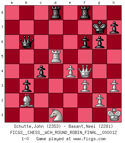 Last move : 1-0 2015 April 4 17:20:56 [Event "FICGS__CHESS__WCH_ROUND_ROBIN_FINAL__000012"] [Site "FICGS"] [Date "2014.11.14"] [Round "1"] [White "Schutte,John"] [Black "Basant,Neel"] [Result "1-0"] [WhiteElo "2353"] [BlackElo "2281"] 1.d4 Nf6 2.c4 e6 3.Nc3 Bb4 4.f3 d5 5.a3 Bxc3+ 6.bxc3 b6 7.cxd5 exd5 8.e3 c5 9.Bb5+ Bd7 10.a4 Nc6 11.Ne2 O-O 12.O-O Re8 13.c4 Qe7 14.Bxc6 Bxc6 15.cxd5 Bxd5 16.Qd3 Rac8 17.Rd1 Nd7 18.Nf4 Bb7 19.d5 Qf6 20.Ra3 Ne5 21.Qc2 a6 22.Qb2 Qd8 23.Ra1 c4 24.Ra3 Bc6 25.Bd2 Bd7 26.Qd4 Qe7 27.d6 Qg5 28.e4 Qf6 29.Be3 Rc6 30.R3a1 b5 31.axb5 axb5 32.Kh1 b4 33.Ra7 b3 34.Nd5 Qxd6 35.Nc3 Qf8 36.Bc1 Qc5 37.Rxd7 Nxd7 38.Qxd7 R6c8 39.Bb2 f6 40.h3 Rf8 41.Rd5 Qf2 42.Nd1 Qb6 43.Rg5 g6 44.Rd5 Rcd8 45.Qg4 Kg7 46.Qf4 1-0 This chess game has been lost on time (started : 2014.11.14 21:20:43) Nimzo-Indian : Kmoch variation Kingside Castling by player Black (move 11) Kingside Castling by player White (move 12) Player White won this chess game. Follow this game move after move (download)It was clear to me that the vulnerable point of the American Grandmaster (Bobby Fischer) was in double-edged, hanging, irrational positions, where he often failed to find a win even in a won position. (Efim Geller) Ich trinke, ich rauche, ich spiele, ich liebe Frauen aber Fernschach ist ein Laster, das ich nicht habe. (Mikhail Nekhemyevich Tal) El Ajedrez es un regaderazo frío para la mente. (Sir John Simon) Des points faibles ou des trous dans la position de l'adversaire doivent être occupés par des pièces et non pas par des pions. (Siegbert Tarrasch) Memory is a complicated thing, a relative to truth, but not its twin. (Barbara Kingsolver, Animal Dreams)