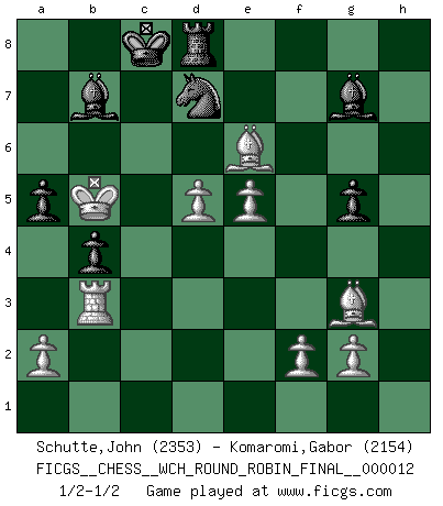 Last move : 1/2-1/2 2015 January 15 19:10:15 [Event "FICGS__CHESS__WCH_ROUND_ROBIN_FINAL__000012"] [Site "FICGS"] [Date "2014.11.14"] [Round "1"] [White "Schutte,John"] [Black "Komaromi,Gabor"] [Result "1/2-1/2"] [WhiteElo "2353"] [BlackElo "2154"] 1.d4 d5 2.c4 c6 3.Nf3 Nf6 4.Nc3 e6 5.Bg5 h6 6.Bh4 dxc4 7.e4 g5 8.Bg3 b5 9.Be2 Bb7 10.h4 Rg8 11.hxg5 hxg5 12.e5 Nd5 13.Nd2 Nd7 14.Rh7 Nxc3 15.bxc3 c5 16.Rb1 Qc7 17.Bh5 Rg7 18.Rxg7 Bxg7 19.Qg4 O-O-O 20.Bxf7 cxd4 21.cxd4 c3 22.Bxe6 cxd2+ 23.Kxd2 Qa5+ 24.Kd3 Qa3+ 25.Rb3 Qa6 26.d5 b4 27.Qc4+ Qxc4+ 28.Kxc4 a5 29.Kb5 1/2-1/2 QGD Slav : 4.Nc3 Queenside Castling by player Black (move 19) This chess game ended in a draw. Follow this game move after move (download)A big shock; the best chess player in history has passed away. (Lajos Portisch, about Bobby Fischer's death) Ich moechte nie einem Club beitreten, der Leute wie mich als Mitglieder aufnimmt. (Woody Allen) No nos podemos resistir a la fascinación de un sacrificio ya que la pasión por los sacrificios es parte de la naturaleza de un jugador de Ajedrez. (Rudolf Spielman) Karpov est une pièce de musée. (Garry Kasparov) Games, world of games... There's always an opponent, and there's always a victim. (Revolver, movie)