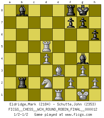 Last move : 1/2-1/2 2015 January 8 22:37:38 [Event "FICGS__CHESS__WCH_ROUND_ROBIN_FINAL__000012"] [Site "FICGS"] [Date "2014.11.14"] [Round "1"] [White "Eldridge,Mark"] [Black "Schutte,John"] [Result "1/2-1/2"] [WhiteElo "2184"] [BlackElo "2353"] 1.e4 e5 2.Nf3 Nc6 3.Bb5 a6 4.Ba4 Nf6 5.O-O Be7 6.Re1 b5 7.Bb3 O-O 8.c3 d5 9.exd5 Nxd5 10.Nxe5 Nxe5 11.Rxe5 c6 12.d4 Bd6 13.Re1 Qh4 14.g3 Qh3 15.Be3 Bg4 16.Qd3 Rae8 17.Nd2 Re6 18.a4 Qh5 19.Bxd5 Qxd5 20.Qf1 Bb8 21.axb5 axb5 22.c4 bxc4 23.Qxc4 h6 24.Qxd5 cxd5 25.Ra5 Rb6 26.Rxd5 Rxb2 1/2-1/2 Ruy Lopez : Closed, 7...O-O Kingside Castling by player White (move 5) Kingside Castling by player Black (move 7) This chess game ended in a draw. Follow this game move after move (download)If cunning alone were needed to excel, women would be the best Chess players. (Albin) Das Schachspiel ist ein See, in welchem eine Mücke baden und ein Elefant ertrinken kann. (Emanuel Lasker) El juego del Ajedrez no es solamente una diversión quieta; algunas cualidades muy valuables de la mente se pueden adquirir y cultivar con el, como convertirlos en habitos disponibles para toda ocasión; ya que la vida es algo así como el Ajedrez. (Benjamin Franklin) Le pion, dans sa simplicité, marche droit devant lui, mais lorsqu'il prend, il le fait obliquement? Ainsi l'homme, tant qu'il reste pauvre, marche dans la droiture et vit honnêtement, mais lorsqu'il recherche les honneurs, il flatte, se parjure et, par les voies obliques, cherche une position supérieure sur l'échiquier du monde. (Jean de Galles) Creativity is allowing yourself to make mistakes. Art is knowing which ones to keep. (Scott Adams)