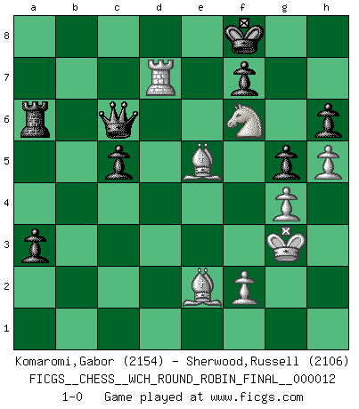 Last move : 1-0 2015 March 27 15:14:39 [Event "FICGS__CHESS__WCH_ROUND_ROBIN_FINAL__000012"] [Site "FICGS"] [Date "2014.11.14"] [Round "1"] [White "Komaromi,Gabor"] [Black "Sherwood,Russell"] [Result "1-0"] [WhiteElo "2154"] [BlackElo "2106"] 1.d4 Nf6 2.c4 g6 3.Nc3 d5 4.Nf3 Bg7 5.Qb3 dxc4 6.Qxc4 O-O 7.e4 a6 8.Qb3 b5 9.Be2 Nc6 10.e5 Be6 11.exf6 Bxb3 12.fxg7 Kxg7 13.axb3 Nxd4 14.Nxd4 Qxd4 15.O-O Qb4 16.Bf3 Qxb3 17.Ra3 Qc4 18.Nd5 b4 19.Re3 a5 20.Rxe7 Rac8 21.Bg5 Rfe8 22.h4 Rxe7 23.Bf6+ Kf8 24.Bxe7+ Kg8 25.h5 h6 26.Re1 g5 27.g4 Rb8 28.Kg2 a4 29.Nf6+ Kg7 30.Nd7 Rc8 31.Re5 Kh8 32.Re4 Qb5 33.Rd4 c5 34.Rd5 a3 35.bxa3 bxa3 36.Bf6+ Kg8 37.Be5 Ra8 38.Nf6+ Kf8 39.Rd7 Ra6 40.Be2 Qc6+ 41.Kg3 1-0 This chess game has been lost on time (started : 2014.11.14 21:20:43) King's Indian defense, 3.Nc3 Kingside Castling by player Black (move 6) Kingside Castling by player White (move 15) Player White won this chess game. Follow this game move after move (download)I'm not a materialistic person, in that, I don't suffer the lack or loss of money. The absence of worldly goods I don't look back on. For Chess is a way I can be as materialistic as I want without having to sell my soul. (Jamie Walter Adams) Die meiste Zeit treffe ich auf Gegner, die meine Enkel sein könnten. Ich bin da, um ihnen zu zeigen, dass sie von mir noch einiges lernen können. (Viktor Kortschnoi) Algunos sacrificios son sólidos, los demás son míos. (Mikhail Tal) D'abord les bases : Jouez et étudiez, puis étudiez et jouez, ensuite jouez et étudiez, puis étudiez et jouez. Deuxièmement : Donnez toujours le meilleur de vous-même ! (Ken Smith) When you don't know what to do, walk fast and look worried. (Anonymous)