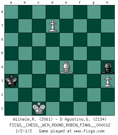 Last move : 1/2-1/2 2015 February 21 21:46:32 [Event "FICGS__CHESS__WCH_ROUND_ROBIN_FINAL__000012"] [Site "FICGS"] [Date "2014.11.14"] [Round "1"] [White "Wilhelm,Robert"] [Black "D Agostino,Gabriele"] [Result "1/2-1/2"] [WhiteElo "2061"] [BlackElo "2134"] 1.e4 c5 2.Nc3 d6 3.Nge2 Nf6 4.d4 cxd4 5.Nxd4 Nc6 6.Bg5 e6 7.Qd2 a6 8.O-O-O Bd7 9.f4 Be7 10.Nf3 b5 11.Bxf6 gxf6 12.Kb1 Rc8 13.f5 h5 14.Bd3 Qa5 15.Rhf1 Ne5 16.Nxe5 fxe5 17.fxe6 Bxe6 18.a3 Rg8 19.g3 Bg5 20.Qe1 Rxc3 21.Qxc3 Qxc3 22.bxc3 Bg4 23.c4 Bxd1 24.Rxd1 bxc4 25.Bxc4 Ke7 26.Rf1 Rb8+ 27.Ka2 f6 28.Bxa6 Be3 29.Bc4 Bd4 30.Rb1 Rxb1 31.Kxb1 Bg1 32.h3 Bf2 33.Be2 Bxg3 34.Bxh5 d5 35.exd5 Kd6 36.c4 Kc5 37.Bg6 Kxc4 38.d6 f5 39.Bxf5 Kb3 40.Kc1 e4 41.d7 Bh4 42.Bxe4 Kxa3 1/2-1/2 Sicilian : Closed Queenside Castling by player White (move 8) 10 pieces endgame at move 35 : White KBPPPP , Black KBPP WHITE : King + 1 Bishop 4 Pawns BLACK : King + 1 Bishop 2 Pawns 9 pieces endgame at move 37 : White KBPPP , Black KBPP WHITE : King + 1 Bishop 3 Pawns BLACK : King + 1 Bishop 2 Pawns 8 pieces endgame at move 39 : White KBPPP , Black KBP WHITE : King + 1 Bishop 3 Pawns BLACK : King + 1 Bishop 1 Pawn 7 pieces endgame at move 42 : White KBPPP , Black KB WHITE : King + 1 Bishop 3 Pawns BLACK : King + 1 Bishop 6 pieces endgame at move 42 : White KBPP , Black KB WHITE : King + 1 Bishop 2 Pawns BLACK : King + 1 Bishop This chess game ended in a draw. Follow this game move after move (download)Chess opens and enriches your mind. (Saudin Robovic) Wenn es im Universum noch irgendwo intelligente Lebewesen gibt, dann kennen sie Go. (Emanuel Lasker) Un entendimiento minucioso de las típicas continuaciones de mate hacen de las mas complicadas combinaciones de sacrificio que conducen hacia ellas no solo no dificiles, sino casi un asunto de rutina. (Siegbert Tarrasch) Il (Jacob Murray) ne joue pas pour le bon coup, mais pour le meilleur. (Eloi Relange) We need strong personalities and only one world champion to attract sponsors. (Anatoly Karpov)