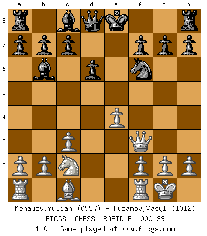Last move : 1-0 2015 January 7 23:33:9 [Event "FICGS__CHESS__RAPID_E__000139"] [Site "FICGS"] [Date "2014.11.16"] [Round "1"] [White "Kehayov,Yulian"] [Black "Puzanov,Vasyl"] [Result "1-0"] [WhiteElo "0957"] [BlackElo "1012"] 1.e4 e5 2.Nf3 Nc6 3.d4 exd4 4.Nxd4 Bc5 5.Be2 Bxd4 6.c3 Bb6 7.O-O d6 8.Na3 Nf6 9.Bf3 Ne5 10.Nc2 Nxf3+ 11.Qxf3 1-0 Scotch game Kingside Castling by player White (move 7) Player White won this chess game. Follow this game move after move (download)It is not enough to be a good player... you must also play well. (Siegbert Tarrasch) Es ist schade, dass viele Schachsportler vergessen, wie wichtig Auftreten und angemessene Kleidung sind. (Alexandra Kosteniuk) Al jugar al Ajedrez entonces, podemos aprender: Primero: Previsión... Segundo: Prudencia... Tercero: Cautela... Y al final, aprendemos del Ajedrez el hábito de no ser desanimados por apariencias malas presentes en el estado de nuestros asuntos, el hábito de la esperanza por una oportunidad favorable y la perseveración de los secretos de los recursos. (Benjamin Franklin) Les échecs c'est le défi de l'alpiniste, toujours plus haut, prêt à tout pour monter à l'assaut du Roi ennemi. Les échecs, c'est de la musique en mouvement, un ballet majestueux pour les yeux. C'est de la poésie composée par les fantômes du passé qui au même titre que Rimbaud ou Verlaine méritent notre admiration. Les échecs, c'est de la peinture ou le moindre mouvement modifie le tableau pour en faire un Picasso ou un Van Gogh. Les échecs, c'est tout et rien, c'est la vie et la mort. Jjulie33 sur le forum de France-Echecs. I don't diet. I just don't eat as much as I'd like to. (Linda Evangelista, supermodel)