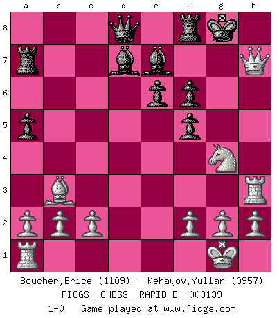 Last move : 1-0 2015 January 24 13:35:11 [Event "FICGS__CHESS__RAPID_E__000139"] [Site "FICGS"] [Date "2014.11.16"] [Round "1"] [White "Boucher,Brice"] [Black "Kehayov,Yulian"] [Result "1-0"] [WhiteElo "1109"] [BlackElo "0957"] 1.e4 d5 2.exd5 Qxd5 3.Nc3 Qd8 4.d4 Nf6 5.Bg5 e6 6.Nf3 Be7 7.Be2 h6 8.Bh4 O-O 9.O-O Nc6 10.Bb5 Bd7 11.Re1 a6 12.Ba4 b5 13.Bb3 a5 14.Nxb5 Na7 15.Nxa7 Rxa7 16.Ne5 c5 17.dxc5 Bxc5 18.Bxf6 gxf6 19.Ng4 Kh7 20.Qd2 Kg8 21.Qxh6 Be7 22.Re3 f5 23.Rh3 f6 24.Qh7+ 1-0 Scandinavian (centre counter) defense Kingside Castling by player Black (move 8) Kingside Castling by player White (move 9) Player White won this chess game. Follow this game move after move (download)Every Pawn is a potential Queen. (James Mason) Schach sollte überall auf der Welt Schulfach werden. Es fördert die geistige Auseinandersetzung. Es lehrt die Demut in der Niederlage. (Garry Kasparov) Con el fin de mejorar tu juego, debes de estudiar los finales antes que todo, ya que mientras que los finales pueden ser estudiados y dominados por sí mismos, el juegomedio y la apertura deben de ser estudiados en relación con los finales. (José Raúl Capablanca) C'est la seule position que je connaisse où les deux camps sont mals. Propos prêtés à V. Anand. To steal ideas from one person is plagiarism. To steal from many is research. (Unknown)