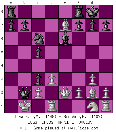 Last move : 0-1 2015 January 13 14:48:24 [Event "FICGS__CHESS__RAPID_E__000139"] [Site "FICGS"] [Date "2014.11.16"] [Round "1"] [White "Leurette,Marc-Antoine"] [Black "Boucher,Brice"] [Result "0-1"] [WhiteElo "1185"] [BlackElo "1109"] 1.e4 c5 2.Nc3 e6 3.g3 Nc6 4.Bg2 Nf6 5.d3 d5 6.exd5 exd5 7.Bg5 Be6 8.Qe2 Be7 9.O-O-O O-O 10.Kb1 d4 11.Ne4 Qa5 12.a3 Nxe4 13.Bxe7 Nc3+ 14.bxc3 dxc3 15.Ka1 Qxa3+ 16.Kb1 Qb2+ 0-1 Sicilian : Closed Queenside Castling by player White (move 9) Kingside Castling by player Black (move 9) Player Black won this chess game. Follow this game move after move (download)Your body has to be in top condition. Your Chess deteriorates as your body does. You can't separate body from mind. (Bobby Fischer) Konzentriere dich auf materielle Gewinne. Nimm, was dir dein Gegner gibt, ausser es gibt einen guten Grund der dagegenspricht. (Robert James Fischer) Un mal plan es mejor que no tener ningún plan. (Frank Marshall) On n'a jamais que l'âge auquel on a commence à jouer aux échecs car après on cesse de vieillir. (Capablanca) May the force be with you. (Han Solo in Star Wars ep.4)