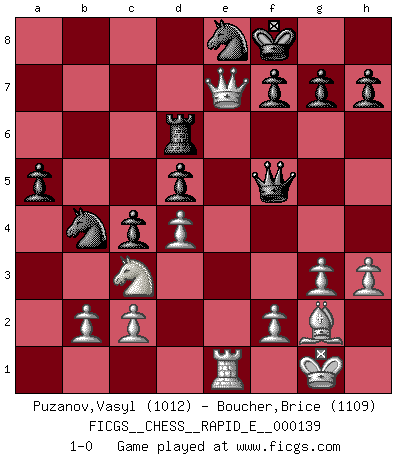 Last move : 1-0 2015 March 19 22:14:10 [Event "FICGS__CHESS__RAPID_E__000139"] [Site "FICGS"] [Date "2014.11.16"] [Round "1"] [White "Puzanov,Vasyl"] [Black "Boucher,Brice"] [Result "1-0"] [WhiteElo "1012"] [BlackElo "1109"] 1.e4 c5 2.Nc3 e6 3.g3 Nc6 4.Bg2 Nf6 5.Nge2 Be7 6.d3 O-O 7.O-O d5 8.exd5 exd5 9.d4 Bf5 10.Be3 c4 11.a3 a6 12.h3 Qd7 13.Nf4 Be6 14.Nxe6 Qxe6 15.Re1 Qd7 16.Qf3 Rad8 17.Rad1 b5 18.Bf4 b4 19.axb4 Nxb4 20.Re2 Rfe8 21.Be5 a5 22.Rde1 Kf8 23.Qf4 Bd6 24.Qh4 Qf5 25.Bxd6+ Rxd6 26.Rxe8+ Nxe8 27.Qe7+ 1-0 Sicilian : Closed Kingside Castling by player Black (move 6) Kingside Castling by player White (move 7) Player White won this chess game. Follow this game move after move (download)By this measure (on the gap between Fischer & his contemporaries), I consider him the greatest world champion. (Garry Kasparov) Pläne sind die Träume des Verständigen. (Ernst Freiherr von Feuchtersleben) El estómago es una parte esencial del maestro de Ajedrez. (Bent Larsen) A ce moment-là, je menaçais de comprendre la position ! (Clément L'Heureux) Watch your thoughts; they become words. Watch your words; they become actions. Watch your actions; they become habits. Watch your habits; they become character. Watch your character; it becomes your destiny. (Frank Outlaw)