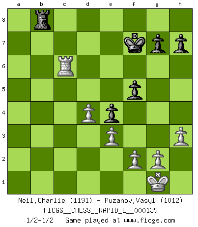 Last move : 1/2-1/2 2015 February 6 22:11:11 [Event "FICGS__CHESS__RAPID_E__000139"] [Site "FICGS"] [Date "2014.11.16"] [Round "1"] [White "Neil,Charlie"] [Black "Puzanov,Vasyl"] [Result "1/2-1/2"] [WhiteElo "1191"] [BlackElo "1012"] 1.Nf3 Nf6 2.d4 d5 3.c4 c6 4.Nc3 e6 5.e3 Nbd7 6.Be2 Bd6 7.cxd5 exd5 8.a3 O-O 9.b4 a6 10.O-O Re8 11.Bb2 Ne4 12.Rc1 Ndf6 13.h3 Nxc3 14.Bxc3 Bf5 15.Re1 Ne4 16.Nd2 Qg5 17.Nf3 Qg6 18.Nh4 Qf6 19.Nxf5 Qxf5 20.Bf3 Rad8 21.Bb2 Bc7 22.a4 Qe6 23.b5 Ba5 24.Re2 axb5 25.axb5 Rc8 26.bxc6 Rxc6 27.Rxc6 bxc6 28.Rc2 Bb4 29.Bxe4 dxe4 30.Qc1 Rc8 31.Ba3 Bxa3 32.Qxa3 f5 33.Qc5 Rb8 34.Qxc6 Qxc6 35.Rxc6 Kf7 1/2-1/2 Reti Opening Kingside Castling by player Black (move 8) Kingside Castling by player White (move 10) This chess game ended in a draw. Follow this game move after move (download)The only thing Chess players have in common is Chess. (Lodewijk Prins) Frage: Gibt es etwas was Sie mehr lieben als Autobahnen ohne Tempobegrenzungen? - Antwort: Deutsche Frauen ohne Tempobegrenzungen. (Loek van Wely) El muchacho (en ese entonces un niño de 12 años llamado Anatoly Karpov) no tiene ni idea de lo que es el Ajedrez y no hay futuro en absoluto para el en esta profesión. (Mikhail Botvinnik) Je ne suis pas le dernier à jouer lâchement des coups douteux pendant le zeïtnot de l'adversaire pour l'achever: en effet les coups qui font le plus peur sont ceux que l'on ne comprend pas. Je me fais souvent peur quand je joue. (Un professeur anonyme) Internal peace cannot coexist with external war. (Don Groves)