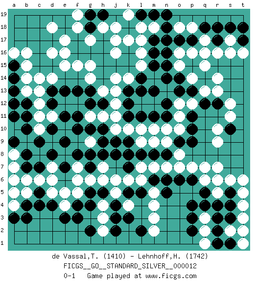 Last move : 0-1 2015 October 24 2:14:44 [Event "FICGS__GO__STANDARD_SILVER__000012"] [Site "FICGS"] [Date "2014.11.17"] [Round "2"] [Black "de Vassal,Thibault"] [White "Lehnhoff,Heinz-Georg"] [Result "0-1"] [Rating 1 "1410"] [Rating 2 "1742"] 1.d4 q16 2.r4 d16 3.k3 q7 4.p3 c6 5.c9 c11 6.c5 d6 7.e9 f6 8.f3 b5 9.b4 g9 10.f10 c14 11.g10 h6 12.g5 g6 13.h9 d5 14.c4 k6 15.h5 j5 16.j4 m5 17.k5 j6 18.l5 l6 19.m6 m7 20.n6 n7 21.o6 o7 22.p6 f12 23.h12 p7 24.h16 k17 25.k16 l16 26.k15 l15 27.l14 m14 28.l13 j17 29.m13 j16 30.j15 s6 31.l8 l7 32.m8 k8 33.k9 m10 34.q12 k10 35.j8 n9 36.n8 j10 37.j9 h11 38.g12 g11 39.g8 h7 40.f11 j12 41.h10 j11 42.o9 o10 43.p9 r9 44.p10 o11 45.p13 s11 46.n14 h13 47.g13 g14 48.f13 e12 49.e13 j14 50.d12 k14 51.m15 c12 52.h15 f15 53.h14 j13 54.m16 l17 55.h17 h18 56.g18 j18 57.f17 d18 58.m17 m18 59.n18 d11 60.e11 t3 61.s4 r13 62.q14 f19 63.g19 l18 64.m19 p18 65.r17 r16 66.q18 r14 67.p17 p16 68.o17 t4 69.s5 t5 70.r6 r7 71.e7 q6 72.q5 r5 73.p4 f5 74.f4 e17 75.l19 k19 76.h19 f18 77.f16 e15 78.n19 g17 79.g16 g15 80.s3 s2 81.r2 q13 82.p11 p14 83.o14 q15 84.s10 r10 85.r12 s12 86.l11 l10 87.b10 o12 88.b11 o8 89.o13 p12 90.a14 b13 91.a13 b15 92.b7 b6 93.c7 a12 94.b12 b14 95.a11 a4 96.a3 a5 97.b3 s17 98.s18 s16 99.t17 t16 100.a15 a16 101.a12 b16 102.d13 c13 103.s1 t2 104.t18 r6 105.n12 q17 106.r18 d7 107.d8 a7 108.b8 f7 109.f8 l9 110.k7 n10 111.m11 m9 112.k8 e4 113.e3 e5 114.d10 o16 115.n16 o15 116.n15 o18 117.n17 e16 118.k12 d14 119.k11 g17 120.n11 a8 121.a9 a6 122.h8 t6 123.g7 c10 124.k13 h4 125.g4 h3 126.j3 h2 127.l2 m4 128.g2 m2 129.j2 q3 130.r3 q2 131.p2 q1 132.q4 t1 133.r1 m3 134.n5 k4 0-1 Here are the names of the openings (joseki) played in the four corners : Corner q4 : r4 q7 Komoku (Somok, Xiao~mu`) 3-4 Point. The komoku (3-4) point is the traditional corner enclosure move.. Corner d4 : d4 c6 Hoshi (Hwajeom, Seongjeom, Xingwei`) 4-4 Point. The star or hoshi (4-4) point, emphasizing influence at the potential expense of territory. Ikken Kakari (Hankan Keolch'im, Yi Gua`jiao~, 1-Space Low Approach). White 2 is the standard approach move to the 4-4. Player White won this Go (weiqi, baduk) game. Follow this game move after move (download)Always remember, keep the balance. [between territory and influence] (Figaro) All art requires courage. (Anne Tucker)