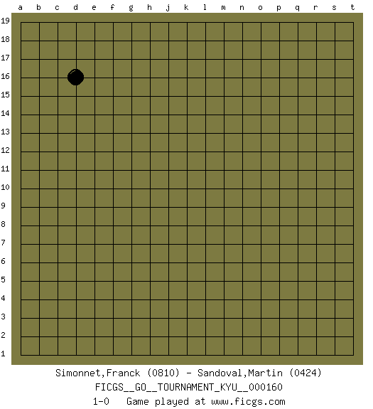 Last move : 1-0 2014 December 19 2:10:36 [Event "FICGS__GO__TOURNAMENT_KYU__000160"] [Site "FICGS"] [Date "2014.11.18"] [Round "1"] [Black "Simonnet,Franck"] [White "Sandoval,Martin"] [Result "1-0"] [Rating 1 "0810"] [Rating 2 "0424"] 1.d16 1-0 This go game has been lost on time (started : 2014.11.18 17:23:40) Here are the names of the openings (joseki) played in the four corners : Player Black won this Go (weiqi, baduk) game. Follow this game move after move (download)A basic: Don't push too hard. (Jansteen) Depression is just anger without enthusiasm. (Unknown)