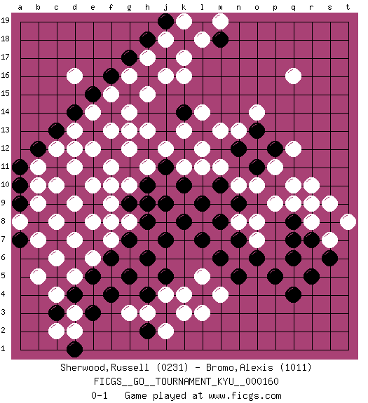 Last move : 0-1 2015 June 17 1:25:6 [Event "FICGS__GO__TOURNAMENT_KYU__000160"] [Site "FICGS"] [Date "2014.11.18"] [Round "1"] [Black "Sherwood,Russell"] [White "Bromo,Alexis"] [Result "0-1"] [Rating 1 "0231"] [Rating 2 "1011"] 1.d4 q16 2.q4 d16 3.d10 k16 4.k10 q10 5.r9 r10 6.p10 q9 7.q8 s9 8.s8 r8 9.r7 r9 10.q7 s7 11.s6 t8 12.r5 p9 13.q6 o10 14.p5 o8 15.l9 m11 16.m10 n10 17.n9 n8 18.m8 l11 19.k12 l12 20.l13 m13 21.k8 k11 22.j11 k13 23.j9 j12 24.h12 h13 25.g13 h11 26.h10 g12 27.f12 g14 28.n7 o7 29.o6 g10 30.f8 f9 31.g9 f10 32.e11 f11 33.f14 f13 34.e13 g13 35.d12 e12 36.e9 e10 37.c11 d11 38.g15 h15 39.h16 j16 40.j17 k17 41.k18 l18 42.l19 j18 43.j19 h17 44.h18 g16 45.g17 k19 46.f16 f15 47.e15 e14 48.d14 d13 49.c13 c12 50.b12 d12 51.h8 c10 52.d8 d9 53.c9 e8 54.e7 b11 55.a11 b10 56.a9 b9 57.b8 c8 58.d6 d7 59.f6 c6 60.c5 b5 61.e5 c4 62.c3 d5 63.g7 e6 64.g5 f7 65.l7 g8 66.h9 f8 67.a10 b7 68.a7 a8 69.j5 k4 70.m6 l5 71.j7 j4 72.h4 h3 73.j3 k3 74.f4 d3 75.h6 g3 76.e3 d2 77.d1 c2 78.h2 j2 79.l4 l3 80.o11 p11 81.p12 q12 82.n5 m4 83.k14 l14 84.n12 n13 85.o13 o14 86.m18 m19 0-1 This go game has been lost on time (started : 2014.11.18 17:23:40) Here are the names of the openings (joseki) played in the four corners : Corner d16 : d16 j11 Hoshi (Hwajeom, Seongjeom, Xingwei`) 4-4 Point. The star or hoshi (4-4) point, emphasizing influence at the potential expense of territory. Player White won this Go (weiqi, baduk) game. Follow this game move after move (download)Learn the eye-stealing tesuji. (Anonymous) There are two types of people in this world, good and bad. The good sleep better, but the bad seem to enjoy the waking hours much more. (Woody Allen)