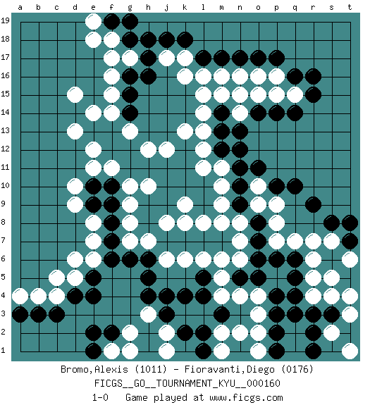 Last move : 1-0 2015 July 29 6:55:29 [Event "FICGS__GO__TOURNAMENT_KYU__000160"] [Site "FICGS"] [Date "2014.11.18"] [Round "1"] [Black "Bromo,Alexis"] [White "Fioravanti,Diego"] [Result "1-0"] [Rating 1 "1011"] [Rating 2 "0176"] 1.q16 d15 2.d4 p5 3.q10 q7 4.q4 o4 5.p3 d9 6.k4 l16 7.k10 d6 8.f6 e7 9.f8 e8 10.f7 p9 11.p10 p16 12.p17 o16 13.o17 o10 14.o11 m4 15.l4 n4 16.m3 d5 17.e5 r4 18.r3 s4 19.s3 t3 20.t2 t4 21.q5 r5 22.q6 r6 23.p6 s2 24.r2 t1 25.p4 q2 26.q3 o3 27.p2 o2 28.o5 p7 29.o7 n6 30.o6 n7 31.o8 o9 32.n10 n8 33.n9 p8 34.n5 m5 35.m6 l6 36.m7 m8 37.l7 r7 38.r9 k9 39.l9 l8 40.k7 k8 41.j9 m9 42.l10 m10 43.n11 m11 44.m12 l11 45.k11 l12 46.n12 l13 47.m13 l14 48.m14 m15 49.n15 n16 50.n17 q1 51.r1 j8 52.j10 k6 53.j7 h7 54.h8 j6 55.j4 j12 56.k12 k13 57.h11 g8 58.h9 g7 59.g6 h12 60.g11 f11 61.f10 e11 62.e10 d10 63.e9 g10 64.f9 g9 65.g12 h10 66.j11 g13 67.f12 e12 68.f13 f14 69.e13 d13 70.m17 m16 71.l17 o1 72.p1 k17 73.k18 j17 74.j18 f17 75.h17 k16 76.g16 f16 77.g15 e14 78.h18 g17 79.h16 q15 80.r15 n14 81.o14 o15 82.p14 p15 83.q14 l15 84.s8 s7 85.t7 t6 86.t8 e6 87.e4 s5 88.n13 n15 89.r16 c4 90.c3 c5 91.b3 b4 92.a3 a4 93.g18 f18 94.f19 e19 95.g19 e18 96.h5 f15 97.g14 m2 98.l2 n2 99.l1 m1 100.l5 m6 101.h6 g2 102.f2 f1 103.e1 g1 104.e2 h3 105.j3 j2 106.k2 j1 107.h4 1-0 This go game has been lost on time (started : 2014.11.18 17:23:40) Here are the names of the openings (joseki) played in the four corners : Corner d4 : d4 d9 Hoshi (Hwajeom, Seongjeom, Xingwei`) 4-4 Point. The star or hoshi (4-4) point, emphasizing influence at the potential expense of territory. Corner q16 : q16 l16 Hoshi (Hwajeom, Seongjeom, Xingwei`) 4-4 Point. The star or hoshi (4-4) point, emphasizing influence at the potential expense of territory. Player Black won this Go (weiqi, baduk) game. Follow this game move after move (download)Grab the border points between two moyos. (Anonymous) When the going gets tactical, the computers get going. (Hyatt)