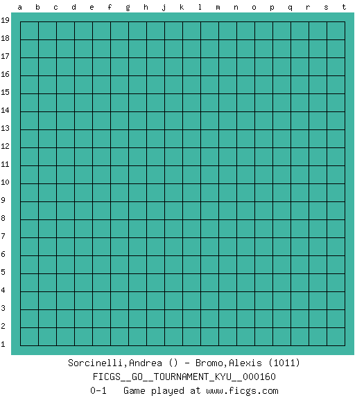 Last move : 0-1 2014 November 18 20:11:39 [Event "FICGS__GO__TOURNAMENT_KYU__000160"] [Site "FICGS"] [Date "2014.11.18"] [Round "1"] [Black "Sorcinelli,Andrea"] [White "Bromo,Alexis"] [Result "0-1"] [Rating 2 "1011"] 0-1 Here are the names of the openings (joseki) played in the four corners : Player White won this Go (weiqi, baduk) game. Follow this game move after move (download)More haste less speed. (John Fairbairn) The Internet is so big, so powerful and pointless that for some people it is a complete substitute for life. (Andrew Brown)
