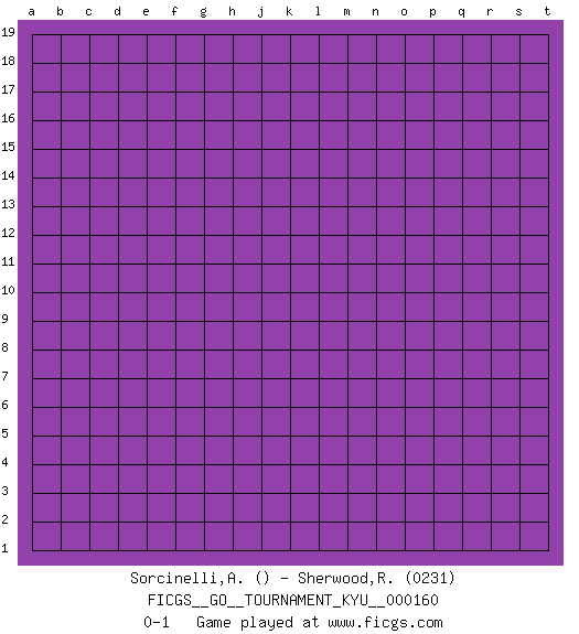 Last move : 0-1 2014 November 18 20:11:49 [Event "FICGS__GO__TOURNAMENT_KYU__000160"] [Site "FICGS"] [Date "2014.11.18"] [Round "1"] [Black "Sorcinelli,Andrea"] [White "Sherwood,Russell"] [Result "0-1"] [Rating 2 "0231"] 0-1 Here are the names of the openings (joseki) played in the four corners : Player White won this Go (weiqi, baduk) game. Follow this game move after move (download)Good moves and bad moves are bedfellows. (Anonymous) Pushing plastic is for the many, pushing virtual pieces is for the fewer, pushing wood is for the very few. (Normajean Yates)