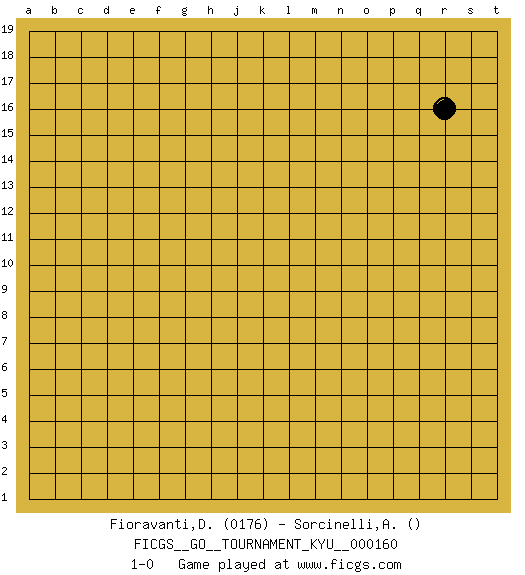 Last move : 1-0 2014 November 19 14:1:13 [Event "FICGS__GO__TOURNAMENT_KYU__000160"] [Site "FICGS"] [Date "2014.11.18"] [Round "1"] [Black "Fioravanti,Diego"] [White "Sorcinelli,Andrea"] [Result "1-0"] [Rating 1 "0176"] 1.r16 1-0 Here are the names of the openings (joseki) played in the four corners : Player Black won this Go (weiqi, baduk) game. Follow this game move after move (download)While the Baroque rules of chess could only have been created by humans, the rules of go are so elegant, organic, and rigorously logical that if intelligent life forms exist elsewhere in the universe, they almost certainly play go. (Edward Lasker, international chess master) He is a liar. I just don't know what the lie is yet. (Horatio Caine, C.S.I. Miami)