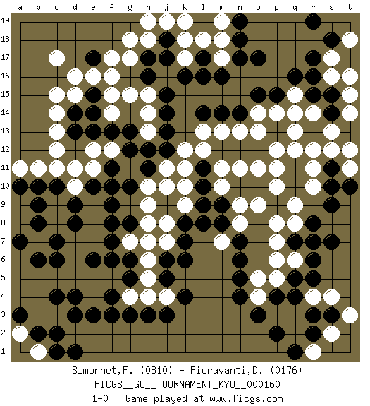 Last move : 1-0 2015 August 4 20:5:35 [Event "FICGS__GO__TOURNAMENT_KYU__000160"] [Site "FICGS"] [Date "2014.11.18"] [Round "1"] [Black "Simonnet,Franck"] [White "Fioravanti,Diego"] [Result "1-0"] [Rating 1 "0810"] [Rating 2 "0176"] 1.q4 c17 2.q16 d5 3.o17 j4 4.f4 f5 5.d4 e4 6.e3 e5 7.d3 d10 8.e17 d16 9.d14 c14 10.e15 d15 11.d13 c13 12.q10 o4 13.o3 e16 14.e14 f17 15.h17 f16 16.d8 e8 17.d9 e9 18.c10 p8 19.n4 p5 20.h16 q9 21.n6 p10 22.q11 r4 23.p4 o5 24.n5 p11 25.q12 r10 26.q5 p6 27.r5 s4 28.r3 t3 29.s3 f15 30.f13 p12 31.q7 s2 32.r2 r1 33.q1 f14 34.g13 q6 35.r6 p7 36.s7 q13 37.q14 r12 38.r13 r11 39.p13 q12 40.j6 r14 41.r15 s13 42.n10 p14 43.p15 o13 44.m14 q15 45.o15 q14 46.s15 d7 47.c7 e7 48.c6 c5 49.b6 c11 50.b10 c12 51.f11 b5 52.b8 h5 53.g3 a6 54.a7 a5 55.p2 g18 56.j18 h19 57.e10 d11 58.f9 j19 59.g5 h6 60.g6 j7 61.k6 n11 62.o10 o11 63.l10 m10 64.m9 m11 65.l11 n9 66.m8 o9 67.f8 d6 68.f7 c3 69.c4 b4 70.c2 b3 71.b2 h4 72.k4 g4 73.f3 a2 74.f6 b1 75.d1 k18 76.a3 a4 77.c1 h15 78.k16 h18 79.j17 k17 80.l16 g17 81.h7 g15 82.j15 l12 83.j12 k11 84.l9 k12 85.j3 m13 86.n14 n13 87.l14 l13 88.j13 m18 89.n18 m17 90.l17 l18 91.n17 k19 92.n19 m19 93.m16 c15 94.e6 b11 95.a10 a11 96.b9 j11 97.j10 k10 98.j9 k9 99.k8 h8 100.g8 g7 101.a3 t14 102.s9 t15 103.r16 s16 104.r17 s17 105.s18 t16 106.t10 t11 107.s11 t12 108.s10 s12 109.h11 e12 110.e13 f12 111.g12 h14 112.j14 h13 113.h12 n8 114.n7 j8 115.k7 h10 116.g10 h9 117.h7 m7 118.l8 g7 119.j5 h7 120.h3 j10 121.r8 q8 122.r7 t18 123.r19 o14 124.s14 e11 125.f10 1-0 This go game has been lost on time (started : 2014.11.18 17:23:40) Here are the names of the openings (joseki) played in the four corners : Corner d16 : c17 e17 San-San (Sam-Sam, San-San) 3-3 Point. The San-San (3-3) point, emphasizing territory at the expense of influence. Ikken Kakari (Hankan Keolch'im, Yi Gua`, Jiao~, 1-Space Approach). White may continue by playing 4-5, 3-5, 4-6, 3-6 or 5-4. Corner q4 : q4 o4 Hoshi (Hwajeom, Seongjeom, Xingwei`) 4-4 Point. The star or hoshi (4-4) point, emphasizing influence at the potential expense of territory. Ikken Takagakari (Hankan Nop'dakeolch'im, Yi Gaojia, 1-Space High Approach). Black typically responds at 6-4 or 3-10. Black 4-10 is played when Black finds play on the right side advantageous. Black 4-8 or 3-8 may be played when Black has support at top. Player Black won this Go (weiqi, baduk) game. Follow this game move after move (download)Avoid the plate connection. (Anonymous) There is no vagueness without wind. (Chinese proverb)