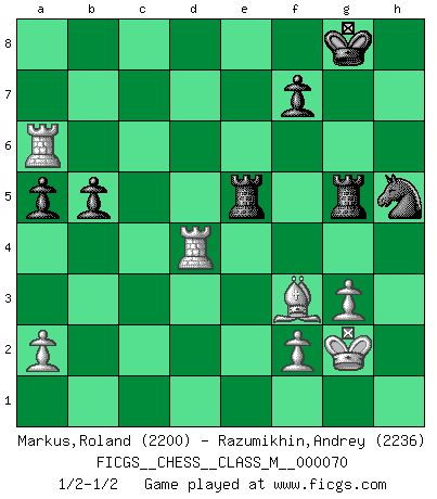 Last move : 1/2-1/2 2015 February 24 17:14:40 [Event "FICGS__CHESS__CLASS_M__000070"] [Site "FICGS"] [Date "2014.11.24"] [Round "1"] [White "Markus,Roland"] [Black "Razumikhin,Andrey"] [Result "1/2-1/2"] [WhiteElo "2200"] [BlackElo "2236"] 1.e4 c5 2.Nf3 d6 3.d4 cxd4 4.Nxd4 Nf6 5.Nc3 a6 6.Be3 Ng4 7.Bg5 h6 8.Bh4 g5 9.Bg3 Bg7 10.h3 Ne5 11.Nf5 Bxf5 12.exf5 Nbc6 13.Nd5 O-O 14.h4 e6 15.Ne3 exf5 16.Nxf5 Re8 17.Be2 Nc4 18.Nxg7 Kxg7 19.Kf1 Nxb2 20.Qd2 g4 21.Bxg4 Nc4 22.Qc3+ N6e5 23.Rd1 Qf6 24.Be2 Rac8 25.Rh3 Ng4 26.Qxf6+ Nxf6 27.Bf4 Ne5 28.c4 Nxc4 29.Rg3+ Kh8 30.Bxh6 Ne4 31.Rb3 b5 32.Bf4 Rc5 33.g3 Kg8 34.h5 Rf5 35.Kg2 Nf6 36.Bf3 Nxh5 37.Bxd6 Rg5 38.Rbd3 Nxd6 39.Rxd6 a5 40.R1d4 R8e5 41.Ra6 1/2-1/2 Sicilian : Najdorf, Byrne (English) attack Kingside Castling by player Black (move 13) This chess game ended in a draw. Follow this game move after move (download)The way he plays Chess demonstrates a man's whole nature. (Stanley Ellin) Ich verachte die Medien. (Robert James Fischer) Yo adoro todas la posiciones. Denme una partida posicional difícil, y la jugaré. Pero posiciones totalmente ganadas, no las tolero. (Hein Donner) Vous savez, camarade Pachman, je n'éprouve pas de plaisir à être ministre, je jouerais plutôt aux échecs comme vous, ou alors ferais une révolution au Venezuela. (Che Guevara à Ludek Pachman, 'Checkmate in Prague', 1975) All art requires courage. (Anne Tucker)