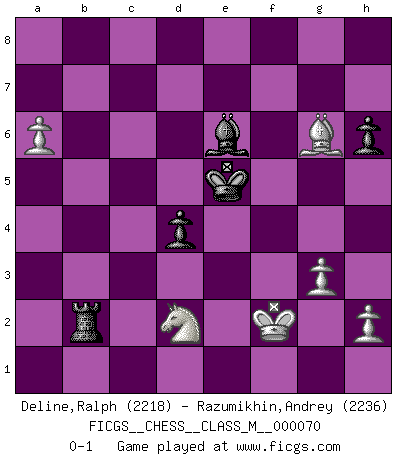 Last move : 0-1 2015 March 23 13:12:6 [Event "FICGS__CHESS__CLASS_M__000070"] [Site "FICGS"] [Date "2014.11.24"] [Round "1"] [White "Deline,Ralph"] [Black "Razumikhin,Andrey"] [Result "0-1"] [WhiteElo "2218"] [BlackElo "2236"] 1.e4 c5 2.Nc3 Nc6 3.f4 g6 4.Nf3 Bg7 5.Bb5 Nd4 6.Nxd4 cxd4 7.Ne2 Qb6 8.a4 a6 9.Bd3 d6 10.b3 Nf6 11.Bb2 e5 12.O-O O-O 13.Qe1 Qd8 14.Kh1 b6 15.Ba3 Re8 16.fxe5 dxe5 17.Ng1 Bd7 18.Qe2 Qc7 19.Bxa6 Nxe4 20.Bc4 Nf6 21.Nf3 e4 22.Ng5 Ng4 23.g3 Ne5 24.Rxf7 Nxf7 25.Rf1 d3 26.Bxf7+ Kh8 27.Qe3 Re5 28.Bb2 dxc2 29.Bxe5 c1Q 30.Bxg7+ Kxg7 31.Rxc1 Qxc1+ 32.Kg2 Qc5 33.Qxc5 bxc5 34.Bd5 Rd8 35.Bxe4 h6 36.Nf3 Be6 37.d4 cxd4 38.Nd2 Kf6 39.b4 Ke5 40.Kf2 Rb8 41.b5 Bb3 42.a5 Rxb5 43.Bxg6 Be6 44.a6 Rb2 0-1 Sicilian : Grand Prix attack Kingside Castling by player White (move 12) Kingside Castling by player Black (move 12) Promotion Queen by player Black (move 29) Player Black won this chess game. Follow this game move after move (download)Later, I began to succeed in decisive games. Perhaps because I realized a very simple truth: not only was I worried, but also my opponent. (Mikhail Tal) Glücklicherweise sind Großmeister Ruben Fines reine Schachbücher weniger phallozentrisch [als seine Schachpsychologie] und deswegen auch weniger lächerlich. (Nigel Short) Si yo gano un torneo, yo lo gano por mí mismo. Yo hago las jugadas. Nadie me ayuda. (Bobby Fischer) Si rien de grave n'est détecté lors de l'analyse d'une position, on joue alors le coup. Seconde règle de Blumenfeld. Crush them ! Make them suffer ! (General Grievous in Star Wars ep.3)