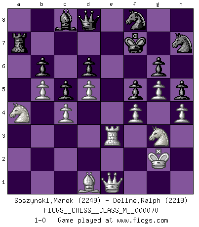 Last move : 1-0 2015 February 3 14:47:56 [Event "FICGS__CHESS__CLASS_M__000070"] [Site "FICGS"] [Date "2014.11.24"] [Round "1"] [White "Soszynski,Marek"] [Black "Deline,Ralph"] [Result "1-0"] [WhiteElo "2249"] [BlackElo "2218"] 1.d4 Nf6 2.Bg5 Ne4 3.Bf4 c5 4.f3 Qa5+ 5.c3 Nf6 6.d5 Qb6 7.Bc1 e6 8.e4 exd5 9.exd5 Bd6 10.Na3 O-O 11.Nh3 Re8+ 12.Be2 h6 13.Nf2 Bf8 14.c4 Qb4+ 15.Kf1 d6 16.g4 a6 17.h4 h5 18.Nc2 Qb6 19.g5 Nh7 20.b3 g6 21.Bb2 a5 22.Qd2 Bg7 23.Bxg7 Kxg7 24.Kg2 a4 25.Rae1 axb3 26.axb3 Nd7 27.Qc3+ Kg8 28.Bd3 Rxe1 29.Rxe1 Qd8 30.f4 Ndf8 31.Ne3 f5 32.Re2 Ra7 33.b4 b6 34.b5 Qd7 35.Ned1 Ra8 36.Qe1 Kf7 37.Nc3 Ra7 38.Bc2 Qd8 39.Nh1 Bd7 40.Re3 Bc8 41.Na4 Rd7 42.Ng3 Ra7 43.Bd1 1-0 Marek Soszynski Thanks for the game. I use lots of different engines until they come up with the move I had thought of originally! Trompowsky attack (Ruth, Opovcensky Opening) Kingside Castling by player Black (move 10) Player White won this chess game. Follow this game move after move (download)Bobby just drops the pieces and they fall on the right squares. (Miguel Najdorf) Sie bekommen vielleicht den Eindruck, dass die Spitzenspieler überhaupt gar nicht so stark sind. Aber das stimmt nicht. Es ist eine Illusion. Mit einem Computer an der Seite ist es sehr leicht, Urteile zu fällen, aber wenn man alleine am Brett sitzt, sieht die Sache ganz anders aus. (Vladimir Kramnik) El Ajedrez es despiadado: debes de estar preparado para matar gente. (Nigel Short) On peut tirer plus d'utilité d'une partie perdue que de 100 parties gagnées. (Capablanca) Computers make it easier to do a lot of things, but most of the things they make it easier to do don't need to be done. (Andy Rooney)