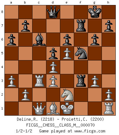 Last move : 1/2-1/2 2015 February 28 20:17:47 [Event "FICGS__CHESS__CLASS_M__000070"] [Site "FICGS"] [Date "2014.11.24"] [Round "1"] [White "Deline,Ralph"] [Black "Proietti,Costantino"] [Result "1/2-1/2"] [WhiteElo "2218"] [BlackElo "2200"] 1.e4 c5 2.Nc3 Nc6 3.f4 g6 4.Nf3 Bg7 5.Bb5 Nd4 6.Nxd4 cxd4 7.Ne2 Nf6 8.e5 Nh5 9.c3 a6 10.Bc4 d5 11.Bd3 O-O 12.cxd4 f6 13.Qb3 fxe5 14.fxe5 e6 15.g3 Qe7 16.Bc2 Qf7 17.Qe3 Bh6 18.Qg1 Bd7 19.d3 Bxc1 20.Rxc1 Qe7 21.Qe3 Rf7 22.Bd1 Raf8 23.Rc3 Bc6 24.a3 Rf3 25.Qd2 Ng7 26.Qc1 R8f7 27.Rc5 Qd8 28.Rc3 Nf5 1/2-1/2 Sicilian : Grand Prix attack Kingside Castling by player Black (move 11) This chess game ended in a draw. Follow this game move after move (download)Chess is above all, a fight ! (Emanuel Lasker) Das Schach ist nichts für kleine Geister, es beansprucht einen vollen Mann, der sich nicht sklavisch an das Überlieferte hält, sondern selbständig die Tiefen des Spiels zu ergründen sucht. (Wilhelm Steinitz) Realmente no sabemos como el juego fue inventado, aunque hay sospechas. Tan pronto como descubramos a los culpables, se los haremos saber. (Bruce Pandolfini) Les Echecs ont trois composantes : le temps, l'espace et le matériel en dernier. (Mikhail Tal) The only sure thing about luck is that it will change. (Wilson Mizner)
