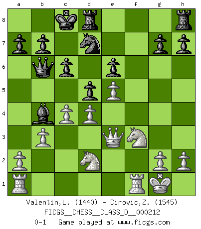 Last move : 0-1 2015 March 11 1:14:29 [Event "FICGS__CHESS__CLASS_D__000212"] [Site "FICGS"] [Date "2014.11.26"] [Round "1"] [White "Valentin,Laurentiu"] [Black "Cirovic,Zeljko"] [Result "0-1"] [WhiteElo "1440"] [BlackElo "1545"] 1.e4 c6 2.d4 d5 3.e5 Bf5 4.Be3 f6 5.f4 e6 6.Nf3 fxe5 7.fxe5 Nd7 8.Bd3 Bxd3 9.Qxd3 Qb6 10.b3 O-O-O 11.Nbd2 Ne7 12.O-O Nf5 13.c4 Nxe3 14.Qxe3 Bb4 0-1 This chess game has been lost on time (started : 2014.11.26 21:54:22) Caro-Kann : Advance variation Queenside Castling by player Black (move 10) Kingside Castling by player White (move 12) Player Black won this chess game. Follow this game move after move (download)I play correspondence chess because it is both art and science while chess is art only. (A player at FICGS) Ich spiele 70 Eröffnungssysteme. (Viktor Kortschnoi) Aún deseo matar a Fischer. (Boris Spassky) Il vaut toujours mieux jouer un plan faux de façon logique que de n'avoir pas de plan du tout. (Victor Kortchnoï) Mac users swear by their computers. PC users swear at their computers. (Author unknown)