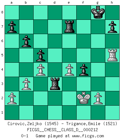 Last move : 0-1 2015 February 27 6:46:9 [Event "FICGS__CHESS__CLASS_D__000212"] [Site "FICGS"] [Date "2014.11.26"] [Round "1"] [White "Cirovic,Zeljko"] [Black "Trigance,Emile"] [Result "0-1"] [WhiteElo "1545"] [BlackElo "1521"] 1.e4 c5 2.f4 d5 3.exd5 Nf6 4.c4 e6 5.dxe6 Bxe6 6.Nc3 Be7 7.Nf3 Nc6 8.d3 O-O 9.Be3 Ng4 10.Bf2 Nxf2 11.Kxf2 Nd4 12.Nxd4 Qxd4+ 13.Kg3 Qf6 14.h4 Rfd8 15.Qf3 Rd4 16.Ne4 Qf5 17.Ng5 Bxg5 18.hxg5 f6 19.gxf6 Qxf6 20.Rh4 Rf8 21.Be2 g5 22.Rh5 gxf4+ 23.Kf2 Rd7 24.Rah1 Qd4+ 25.Ke1 Rg7 26.Qe4 Qxe4 27.dxe4 b6 28.R1h2 Re8 29.b3 R8e7 30.Bd3 Rg3 31.Ke2 Bg4+ 32.Kf2 Bxh5 33.Rxh5 Rxd3 0-1 Sicilian : Grand Prix attack Kingside Castling by player Black (move 8) Player Black won this chess game. Follow this game move after move (download)Without error there can be no brilliancy. (Emanuel Lasker) Ohne Fehler kann es keine Brillanz geben. (Emanuel Lasker) El Ajedrez es realmente noventa y nueve por ciento calculación. (Soltis) C'est une question de caractère, Beaucoup de gens perdent leur motivation très vite. D'autres, ils sont rares, peuvent la conserver très longtemps. J'aime les échecs, encore aujourd'hui je suis heureux d'analyser des parties. J'aime toujours gagner, je déteste encore perdre. Bien jouer est important pour mon intégrité intellectuelle et morale. Et puis les échecs vivent en ce moment une période historique grâce à Internet. Ils se développent dans les systèmes éducatifs à travers le monde. Ils sortent de leur ghetto, et c'est mon rôle de mener à bien cette révolution. (Gary Kasparov) The arrogant army will lose certainly the battle. (Chinese proverb)