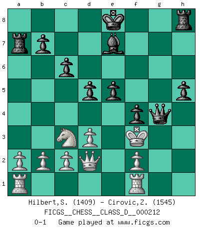 Last move : 0-1 2015 January 25 23:44:5 [Event "FICGS__CHESS__CLASS_D__000212"] [Site "FICGS"] [Date "2014.11.26"] [Round "1"] [White "Hilbert,Stephan J."] [Black "Cirovic,Zeljko"] [Result "0-1"] [WhiteElo "1409"] [BlackElo "1545"] 1.e4 c6 2.Nc3 e5 3.Bc4 Nf6 4.Nf3 d6 5.O-O Bg4 6.h3 Bh5 7.d3 Nbd7 8.Bg5 Be7 9.g4 Nxg4 10.hxg4 Bxg4 11.Be3 f5 12.Be6 g6 13.Kg2 h5 14.exf5 gxf5 15.Qd2 Bxf3+ 16.Kxf3 f4 17.Bxa7 Rxa7 18.Ne4 d5 19.Bxd7+ Qxd7 20.Nc3 Qg4+ 0-1 Caro-Kann defense Kingside Castling by player White (move 5) Player Black won this chess game. Follow this game move after move (download)A passed Pawn increases in strength as the number of pieces on the board diminishes. (Capablanca) Obendrein hat der FIDE-Präsident den Revolutionsführer Gaddafi zum »Großmeister« ernannt, am Ende der WM. Das ist lächerlich! (Joel Lautier) Entre mas años cumplo, mas valoro los Peones. (Keres) Roi des jeux et jeu des rois, les échecs portent en eux un sentiment d'infini. Ils donnent à celui qui s'est efforcé d'en approfondir les arcanes l'impression de n'être pas à la mesure de l'homme; en fait, ils constituent un résumé de l'univers, un microcosme, et figurent cette grande échelle qui, dans les plans de la lumière descend jusqu'à la matière, qui des abîmes insondables remonte jusqu'en l'infini de Dieu. (Pyrame) Sometimes it pays to stay in bed in Monday, rather than spending the rest of the week debugging Monday's code. (Dan Salomon)