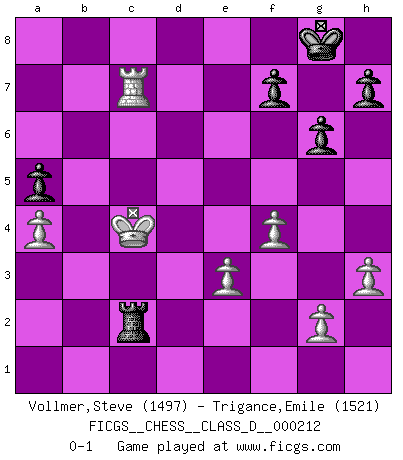 Last move : 0-1 2014 December 13 10:3:48 [Event "FICGS__CHESS__CLASS_D__000212"] [Site "FICGS"] [Date "2014.11.26"] [Round "1"] [White "Vollmer,Steve"] [Black "Trigance,Emile"] [Result "0-1"] [WhiteElo "1497"] [BlackElo "1521"] 1.d4 Nf6 2.c4 g6 3.Nc3 d5 4.Bf4 Bg7 5.e3 O-O 6.Bd3 c6 7.Nge2 Nbd7 8.O-O dxc4 9.Bxc4 Nb6 10.Bd3 Nbd5 11.Nxd5 Nxd5 12.Bg3 Bg4 13.Qd2 Bxe2 14.Qxe2 Qd7 15.Rfd1 e6 16.a3 Qe7 17.Rac1 e5 18.dxe5 Bxe5 19.Bxe5 Qxe5 20.Bc4 Nb6 21.Rd2 Nxc4 22.Rxc4 Rfd8 23.Rcd4 Qe7 24.Qd1 Rxd4 25.Rxd4 b6 26.Rd7 Qe6 27.h3 a5 28.Rb7 c5 29.Qd7 Qxd7 30.Rxd7 b5 31.Kf1 Rc8 32.Ke2 b4 33.Ra7 bxa3 34.bxa3 c4 35.Kd2 Rb8 36.Kc2 Rb5 37.a4 Rc5 38.Kc3 Rd5 39.Rc7 Rd3+ 40.Kxc4 Rd2 41.f4 Rc2+ 0-1 King's Indian defense, 3.Nc3 Kingside Castling by player Black (move 5) Kingside Castling by player White (move 8) Player Black won this chess game. Follow this game move after move (download)I won't play with you anymore. You have insulted my friend. - When an opponent cursed himself for a blunder. (Miguel Najdorf) Nach Morphy wurde nichts neues mehr in der Behandlung offener Positionen gefunden. (Mikhail Moiseyevich Botvinik) Aún el Rey más flojo huye despavorido ante la amenaza de un Jaque doble. (Aaron Nimzowitsch) Il s'avisa de me proposer d'apprendre les échecs qu'il jouait un peu... me voilà forcené des échecs. J'achète un échiquier, je m'enferme dans ma chambre, j'y passe des jours et des nuits à vouloir apprendre par cœur toutes les parties. (Jean-Jacques Rousseau, Confessions) Empty your mind, be formless, shapeless — like water. (Bruce Lee)