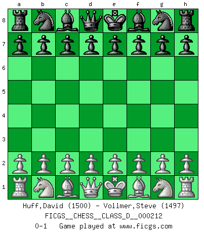 Last move : 0-1 2015 January 6 4:15:38 [Event "FICGS__CHESS__CLASS_D__000212"] [Site "FICGS"] [Date "2014.11.26"] [Round "1"] [White "Huff,David"] [Black "Vollmer,Steve"] [Result "0-1"] [WhiteElo "1500"] [BlackElo "1497"] 0-1 This chess game has been lost on time (started : 2014.11.26 21:54:22) Player Black won this chess game. Follow this game move after move (download)Checkers is for tramps. (Paul Morphy) Wenn Capablanka heute auf der Schachbühne erscheinen würde, hätte er ein halbes Jahr gebraucht um sich die Schachtheorie anzueignen. Und dann hätte er alles und jeden besiegt. (Mikhail Moiseyevich Botvinik) En el Ajedrez, cuando menos, el valiente hereda la tierra. (Edmar Mednis) L'ordinateur a tué l'originalité. Il n'y a plus guère d'aventures sur l'échiquier. (Jacob Murray) Over-the-board chess is the favorite of mortals, correspondence chess is the favorite of the gods. (Eduard Dyckhoff)