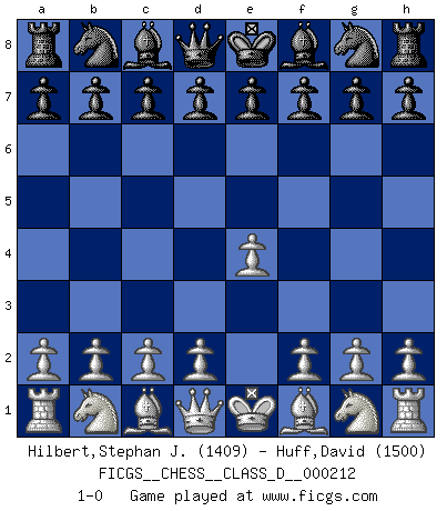 Last move : 1-0 2015 January 6 4:15:38 [Event "FICGS__CHESS__CLASS_D__000212"] [Site "FICGS"] [Date "2014.11.26"] [Round "1"] [White "Hilbert,Stephan J."] [Black "Huff,David"] [Result "1-0"] [WhiteElo "1409"] [BlackElo "1500"] 1.e4 1-0 This chess game has been lost on time (started : 2014.11.26 21:54:22) King's pawn Opening Player White won this chess game. Follow this game move after move (download)Chess is a cold bath for the mind. (Sir John Simon) Die unerbitterlichsten Regeln im Schach sind die Ausnahmen. (Savielly Grigorievitsch Tartakower) Una clavada es mas poderosa que una espada. (Fred Reinfeld) Même si l'adversaire joue le coup analysé précédemment, recommencez l'analyse en voyant la nouvelle position. Première règle de Blumenfeld Experience is the name we all give to our mistakes. (Oscar Wilde)