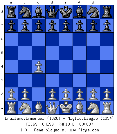 Last move : 1-0 2014 December 29 15:33:26 [Event "FICGS__CHESS__RAPID_D__000087"] [Site "FICGS"] [Date "2014.11.28"] [Round "1"] [White "Brulland,Emmanuel"] [Black "Niglio,Biagio"] [Result "1-0"] [WhiteElo "1328"] [BlackElo "1354"] 1.c4 1-0 This chess game has been lost on time (started : 2014.11.28 21:26:32) English Opening Player White won this chess game. Follow this game move after move (download)The hallmark of the artist is simplicity. (Larry Evans) Nie in meinem Leben habe ich die französische Verteidigung gespielt, welche die Stumpfsinnigste von allen ist. (Wilhelm Steinitz) La batalla por la última verdad nunca sera ganada. Y es por eso que el Ajedrez es tan fascinante. (Hans Kmoch) La vie est comme un jeu d'échecs : nous esquissons un plan, mais celui-ci est tributaire de ce que daignent faire l'adversaire aux échecs et le destin dans la vie. (Arthur Schopenhauer) Man is reluctant to give credit for intelligence to anyone, except his enemies. (Albert Einstein)