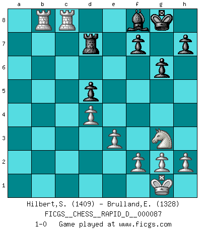 Last move : 1-0 2015 January 29 16:59:18 [Event "FICGS__CHESS__RAPID_D__000087"] [Site "FICGS"] [Date "2014.11.28"] [Round "1"] [White "Hilbert,Stephan J."] [Black "Brulland,Emmanuel"] [Result "1-0"] [WhiteElo "1409"] [BlackElo "1328"] 1.b4 b5 2.Bb2 Bb7 3.Nf3 Nf6 4.e3 e6 5.a3 Be7 6.Bxb5 O-O 7.Be2 Re8 8.c4 d5 9.cxd5 exd5 10.O-O c6 11.d3 Nbd7 12.Nbd2 Ba6 13.Nb3 Rb8 14.Rb1 Bb5 15.Nbd4 a6 16.Qc2 Qb6 17.a4 Bxb4 18.axb5 axb5 19.Nf5 Bf8 20.N3h4 g6 21.Ng3 Bg7 22.Nf3 Ng4 23.Nd4 Ngf6 24.Rfc1 Ne5 25.Nxc6 Nxc6 26.Qxc6 Red8 27.Qxb6 Rxb6 28.Be5 Nd7 29.Bc7 Rdb8 30.d4 R6b7 31.Bxb8 Rxb8 32.Bxb5 Rb7 33.Bxd7 Rxd7 34.Rc8+ Bf8 35.R1b8 1-0 Polish (Sokolsky) opening Kingside Castling by player Black (move 6) Kingside Castling by player White (move 10) Player White won this chess game. Follow this game move after move (download)There must have been a time when men were demigods, or they could not have invented Chess. (Gustav Schenk) Kann Schach nicht schließlich das Nationalspiel der Deutschen werden? Und welche weiteren Ausblicke bieten sich dann dar! Welche Hebung des allgemeinen Kultur-Niveaus, ja der Moral, wenn das Schachbrett den Kartentisch verdrängen würde! Wahrlich, ein Ziel, des Schweißes der Edlen wert! (Siegbert Tarrasch) Antes de los Finales, los dioses han colocado el Juego Medio. (Siegbert Tarrasch) Que feriez-vous si vous étiez en train de jouer aux échecs et que la fin du monde arrive ? Je continuerais à jouer. (Saint Borromée) SEO proverb : Make your website optimized for human beings, not for search engines.