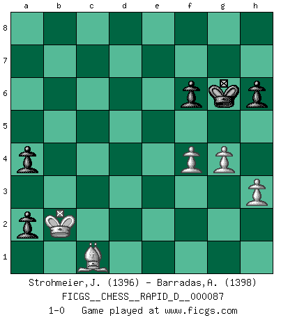Last move : 1-0 2015 February 16 4:46:55 [Event "FICGS__CHESS__RAPID_D__000087"] [Site "FICGS"] [Date "2014.11.28"] [Round "1"] [White "Strohmeier,Josef"] [Black "Barradas,Anderson"] [Result "1-0"] [WhiteElo "1396"] [BlackElo "1398"] 1.e4 e5 2.Nf3 Nc6 3.Bb5 a6 4.Ba4 b5 5.Bb3 h6 6.c3 Nf6 7.O-O Nxe4 8.d4 exd4 9.cxd4 d5 10.Re1 Be7 11.h3 O-O 12.a3 a5 13.Nc3 Nxc3 14.bxc3 a4 15.Bc2 f5 16.Ne5 Nxe5 17.Rxe5 c6 18.Qh5 Qe8 19.Qf3 Qf7 20.Bb2 Bd6 21.Re2 Bd7 22.Rae1 Rae8 23.Rxe8 Rxe8 24.Rxe8+ Qxe8 25.g3 Qg6 26.Bc1 Be6 27.Kg2 c5 28.dxc5 Bxc5 29.g4 d4 30.cxd4 Bxd4 31.Bxf5 Bxf5 32.Qxf5 Qf6 33.Qxf6 gxf6 34.f4 Kg7 35.Kf3 Kg6 36.Ke4 Bc3 37.Kd5 b4 38.Kc4 bxa3 39.Kxc3 a2 40.Kb2 1-0 Ruy Lopez : Caro variation Kingside Castling by player White (move 7) Kingside Castling by player Black (move 11) 10 pieces endgame at move 39 : White KBPPP , Black KPPPP WHITE : King + 1 Bishop 3 Pawns BLACK : King + 4 Pawns Player White won this chess game. Follow this game move after move (download)In Fischer's hands, a slight theoretical advantage is as good a being a Queen ahead. (Isaac Kashdan) Kasparov stellt für gewöhnlich die Regeln auf und bricht sie dann selbst wieder. (Alexej Shirov) Cada Peón es una Reina en potencia. (James Mason) Botvinnik disait en comparant les échecs à la musique: Il existe une science dont le but est l'étude de l'acoustique et des sons. Mais il y a aussi un art qui se sert de l'océan des sons : c'est la musique. De toute évidence, il en est de même pour la pensée. La logique est l'étude des lois de la réflexion et les échecs reflètent, en tant qu'art, le côté logique de la réflexion, sous la forme d'images artistiques... Extrait de Fischer - Spassky, Reykjavik 1972 par Alexander & F. Wyndham (Ed. Solar), p 37. All maxims have their antagonist maxims; proverbs should be sold in pairs, a single one being but a half truth. (William Mathews)