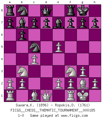 Last move : 1-0 2015 March 14 13:28:10 [Event "FICGS__CHESS__THEMATIC_TOURNAMENT__000185"] [Site "FICGS"] [Date "2014.11.29"] [Round "1"] [White "Suwara,Kazimierz"] [Black "Ropokis,Dimitrios"] [Result "1-0"] [WhiteElo "1896"] [BlackElo "1761"] 1.d4 Nf6 2.c4 e5 3.dxe5 Ne4 4.Nf3 b6 5.Nbd2 Bb7 6.g3 Be7 7.Bg2 Nc5 8.O-O O-O 9.Nb3 1-0 This chess game has been lost on time (started : 2014.11.29 22:6:42) Budapest : Fajarowicz variation Kingside Castling by player White (move 8) Kingside Castling by player Black (move 8) Player White won this chess game. Follow this game move after move (download)Of all my Russian books, the defense contains and diffuses the greatest 'warmth' which may seem odd seeing how supremely abstract Chess is supposed to be. (Vladimir Nabokov) Schach sollte überall auf der Welt Schulfach werden. Es fördert die geistige Auseinandersetzung. Es lehrt die Demut in der Niederlage. (Garry Kasparov) El Ajedrez es parte de la cultura, y si una cultura esta en decadencia, entonces también el Ajedrez declinará. (Mikhail Botvinnik) Je ne suis pas le dernier à jouer lâchement des coups douteux pendant le zeïtnot de l'adversaire pour l'achever: en effet les coups qui font le plus peur sont ceux que l'on ne comprend pas. Je me fais souvent peur quand je joue. (Un professeur anonyme) Memory is a way of holding onto the things you love, the things you are, the things you never want to lose. (from the television show: The Wonder Years)