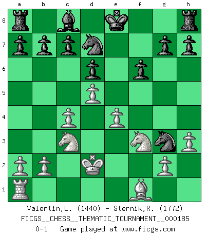 Last move : 0-1 2015 February 22 19:56:27 [Event "FICGS__CHESS__THEMATIC_TOURNAMENT__000185"] [Site "FICGS"] [Date "2014.11.29"] [Round "1"] [White "Valentin,Laurentiu"] [Black "Sternik,Ryszard"] [Result "0-1"] [WhiteElo "1440"] [BlackElo "1772"] 1.d4 Nf6 2.c4 e5 3.d5 Bc5 4.Bg5 Bxf2+ 5.Kxf2 Ng4+ 6.Ke1 Qxg5 7.Nf3 Qe3 8.h3 Nf2 9.Qd2 Qxd2+ 10.Kxd2 Nxh1 11.Nxe5 Ng3 12.Nc3 d6 13.Nf3 Nd7 14.e4 f6 0-1 This chess game has been lost on time (started : 2014.11.29 22:6:42) Budapest defense declined Player Black won this chess game. Follow this game move after move (download)A thorough understanding of the typical mating continuations makes the most complicated sacrificial combinations leading up to them not only not difficult, but almost a matter of course. (Siegbert Tarrasch) Zu meiner Zeit war ein 20 jähriger ein junger Spieler, heute ist er ein Veteran. (Garry Kasparov) Aquel que ve no otra dirección en el juego que la de dar Jaque Mate a su oponente, nunca será un buen jugador de Ajedrez. (Euwe) Votre seul travail dans les ouvertures est d'obtenir un milieu de partie jouable. (Lajos Portish) An expert is a man who has made all the mistakes which can be made in a very narrow field. (Niels Bohr)