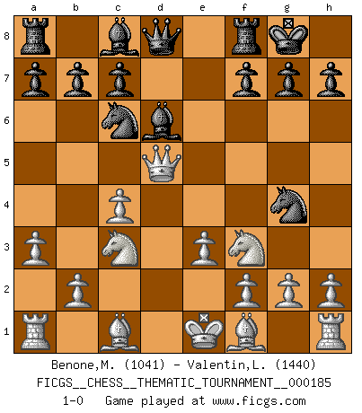 Last move : 1-0 2015 February 15 7:35:15 [Event "FICGS__CHESS__THEMATIC_TOURNAMENT__000185"] [Site "FICGS"] [Date "2014.11.29"] [Round "1"] [White "Benone,Mateia"] [Black "Valentin,Laurentiu"] [Result "1-0"] [WhiteElo "1041"] [BlackElo "1440"] 1.d4 Nf6 2.c4 e5 3.dxe5 Ng4 4.Nf3 Bc5 5.e3 O-O 6.Qd5 d6 7.exd6 Bxd6 8.Nc3 Nc6 9.a3 1-0 This chess game has been lost on time (started : 2014.11.29 22:6:42) Budapest : Adler variation Kingside Castling by player Black (move 5) Player White won this chess game. Follow this game move after move (download)You know, comrade Pachman, I don't enjoy being a Minister, I would rather play Chess like you. (Che Guevara) Als er Schachweltmeister wurde ließ er praktisch alle stärksten Sovietspieler für sich arbeiten. Wenn ein auch nur mittelmässiger Meister ein Spezialist für eine bestimmte Eröffnung war, wurde er von Karpov gerufen. Das wurde alles geheim gehalten. (Mikhail Moiseyevich Botvinik) No hay precio que sea tan grande por la cabellera del Rey enemigo. (Koblentz) Le moment que je préfère le plus dans une rencontre, c'est celui où je sens que la personnalité de l'adversaire se brise. (Robert Fischer) Experiences are the keys to life. (Daniel Parmet)