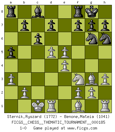 Last move : 1-0 2015 February 2 18:30:0 [Event "FICGS__CHESS__THEMATIC_TOURNAMENT__000185"] [Site "FICGS"] [Date "2014.11.29"] [Round "1"] [White "Sternik,Ryszard"] [Black "Benone,Mateia"] [Result "1-0"] [WhiteElo "1772"] [BlackElo "1041"] 1.d4 Nf6 2.c4 e5 3.dxe5 Ng4 4.Bf4 Nc6 5.Nf3 Bb4+ 6.Nbd2 Qe7 7.a3 Bc5 8.e3 a5 9.Nb3 O-O 10.Nxc5 Qxc5 11.Qd5 Qxd5 12.cxd5 Ne7 13.h3 Nh6 14.e4 Ng6 15.Bg3 c6 16.O-O-O 1-0 Budapest : Rubinstein variation Kingside Castling by player Black (move 9) Queenside Castling by player White (move 16) Player White won this chess game. Follow this game move after move (download)Chess, like love, is infectious at any age. (Flohr) Mein erstes Ziel war nicht, die Partie zu gewinnen, sondern eine Figur zu opfern. -- der junge (Wilhelm Steinitz) Observen a Garry Kasparov. Después de una derrota, invariablemente el gana la próxima partida. Prácticamente hace pedazos a su siguiente oponente. Eso es algo que tenemos que aprender a lograr. (Maurice Ashley) La vérité est comme le meilleur coup aux échecs : elle existe, mais il faut la chercher. (Arturo Perez-Reverte) Strategy without tactics is the slowest route to victory. Tactics without strategy is the noise before defeat. (Sun Tzu)