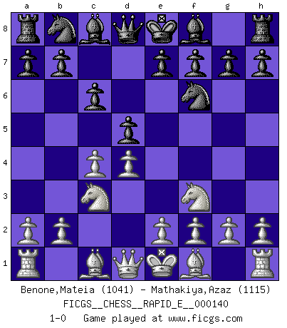 Last move : 1-0 2015 January 10 16:21:34 [Event "FICGS__CHESS__RAPID_E__000140"] [Site "FICGS"] [Date "2014.12.01"] [Round "1"] [White "Benone,Mateia"] [Black "Mathakiya,Azaz"] [Result "1-0"] [WhiteElo "1041"] [BlackElo "1115"] 1.Nf3 d5 2.d4 c6 3.c4 Nf6 4.Nc3 1-0 This chess game has been lost on time (started : 2014.12.01 22:14:48) Reti Opening Player White won this chess game. Follow this game move after move (download)That's what Chess is all about. One day you give your opponent a lesson, the next day he gives you one. (Bobby Fischer) Alle Schachspieler sollten auch ein Hobby haben. (Savielly Grigorievitsch Tartakower) El hombre es un frívolo, una creatura engañosa y como un jugador de Ajedrez, se preocupa mas por el proceso de obtener su meta que de la meta por sí misma. (Dostoyevsky) Si je n'étais pas joueur d'échecs, je serais le meilleur dans quelque chose d'autre. (Anatoli Karpov) I find your interest interesting. (Gregory House, House M.D.)