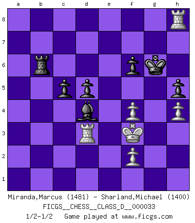 Last move : 1/2-1/2 2007 June 30 16:55:16 [Event "FICGS__CHESS__CLASS_D__000033"] [Site "FICGS"] [Date "2007.02.27"] [Round "1"] [White "Miranda,Marcus"] [Black "Sharland,Michael"] [Result "1/2-1/2"] [WhiteElo "1481"] [BlackElo "1400"] 1.e4 e5 2.Nf3 Nc6 3.Bb5 a6 4.Ba4 Nf6 5.O-O Bc5 6.c3 O-O 7.d4 Bb6 8.Nbd2 exd4 9.e5 dxc3 10.exf6 cxd2 11.fxg7 Kxg7 12.Bxd2 d5 13.Re1 Bg4 14.Bxc6 bxc6 15.Qc1 Bxf3 16.Bh6+ Kg8 17.Qf4 Qd6 18.Qxd6 cxd6 19.Bxf8 Kxf8 20.gxf3 Bd4 21.Rac1 c5 22.Rcd1 a5 23.f4 Rb8 24.Re2 a4 25.Kg2 Kg7 26.Kf3 Kf6 27.R1d2 h6 28.Rd1 Kf5 29.Rd3 Rb6 30.h3 Rb4 31.b3 Kf6 32.Re8 Kf5 33.Re7 f6 34.Rh7 Kg6 35.Rh8 axb3 36.axb3 Rb6 37.h4 h5 38.Rd8 Kf5 39.b4 Ke6 40.Re8+ Kf5 41.bxc5 dxc5 42.Rh8 Kg6 1/2-1/2 Ruy Lopez : Moeller defense Kingside Castling by player White (move 5) Kingside Castling by player Black (move 6) This chess game ended in a draw. Follow this game move after move (download)Alekhine is a poet who creates a work of art out of something that would hardly inspire another man to send home a picture post card. (Max Euwe) Auf jeden Fall musst du zuerst Rechtsanwalt werden, damit du deine eigenen Interessen und die deiner Familie vertreten kannst. [Brief an seinen Sohn] (José Raúl Capablanca) Yo no le temo a Spassky. Todos saben que yo soy el mejor. Uno no necesita un torneo para probarlo. (Bobby Fischer) Seul un grand joueur sait à quel point il joue faiblement. (Xavier Tartacover) We need strong personalities and only one world champion to attract sponsors. (Anatoly Karpov)