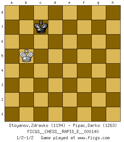 Last move : 1/2-1/2 2015 January 15 20:20:54 [Event "FICGS__CHESS__RAPID_E__000140"] [Site "FICGS"] [Date "2014.12.01"] [Round "1"] [White "Stoyanov,Zdravko"] [Black "Pipac,Darko"] [Result "1/2-1/2"] [WhiteElo "1194"] [BlackElo "1263"] 1.e4 Nc6 2.Nf3 e5 3.Bb5 d6 4.Bxc6+ bxc6 5.h3 Nf6 6.d3 h6 7.a3 Qe7 8.O-O d5 9.Re1 Qe6 10.exd5 cxd5 11.c3 e4 12.Bf4 Qc6 13.Ne5 Qe6 14.Nf3 Bd6 15.dxe4 dxe4 16.Bd2 O-O 17.Nd4 Qd5 18.Be3 Bc5 19.b4 Bxd4 20.cxd4 Be6 21.Nc3 Qb3 22.Qc1 Rad8 23.Rb1 Qc4 24.Bxh6 gxh6 25.Qxh6 Qxc3 26.Qxf6 Qxd4 27.Qg5+ Qg7 28.Qxg7+ Kxg7 29.Rxe4 Rg8 30.Rc1 Rd7 31.Re5 Bd5 32.Rd1 c6 33.b5 Kf8 34.bxc6 Bxc6 35.Rxd7 Bxd7 36.Ra5 Bxh3 37.g3 Bg4 38.Rxa7 Bf3 39.Kf1 Kg7 40.Ke1 Ra8 41.Rxa8 Bxa8 42.Ke2 Kf6 43.Ke3 Kf5 44.a4 Bc6 45.a5 Bb5 46.f3 f6 47.g4+ Kg5 48.Ke4 Bc6+ 49.Ke3 f5 50.gxf5 Kxf5 51.a6 Ke5 52.Kd3 Bxf3 53.Kc3 Kd6 54.Kb4 Kc7 55.Kc5 Bb7 56.axb7 Kxb7 57.Kb5 Kc7 1/2-1/2 KP : Nimzovich defense Kingside Castling by player White (move 8) Kingside Castling by player Black (move 16) 10 pieces endgame at move 36 : White KRPPP , Black KRBPP WHITE : King + 1 Rook 3 Pawns BLACK : King + 1 Rook 1 Bishop 2 Pawns 9 pieces endgame at move 38 : White KRPPP , Black KRBP WHITE : King + 1 Rook 3 Pawns BLACK : King + 1 Rook 1 Bishop 1 Pawn 8 pieces endgame at move 41 : White KRPPP , Black KBP WHITE : King + 1 Rook 3 Pawns BLACK : King + 1 Bishop 1 Pawn 7 pieces endgame at move 41 : White KPPP , Black KBP WHITE : King + 3 Pawns BLACK : King + 1 Bishop 1 Pawn 6 pieces endgame at move 50 : White KPPP , Black KB WHITE : King + 3 Pawns BLACK : King + 1 Bishop 5 pieces endgame at move 50 : White KPP , Black KB WHITE : King + 2 Pawns BLACK : King + 1 Bishop 4 pieces endgame at move 52 : White KP , Black KB WHITE : King + 1 Pawn BLACK : King + 1 Bishop 3 pieces endgame at move 56 : White KP , Black K WHITE : King + 1 Pawn BLACK : King + 2 pieces endgame at move 56 : White K , Black K WHITE : King + BLACK : King + This chess game ended in a draw. Follow this game move after move (download)Before the endgame, the Gods have placed the middle game. (Siegbert Tarrasch) Rauchen ist dem Schachspieler bei seiner Arbeit, also im Wettkampf, untersagt. (Viktor Kortschnoi) No todos los artistas son jugadores de Ajedrez, pero todos los jugadores de Ajedrez son artistas. (Marcel Duchamp) Dieu déplace le joueur, et celui-ci la pièce. Quel Dieu derrière Dieu commence donc la trame ? Arturo Perez-Reverte (prix de littérature policière 1993). Ah, beer! The cause of, and the solution to, all of life's problems. (Homer Simpson)
