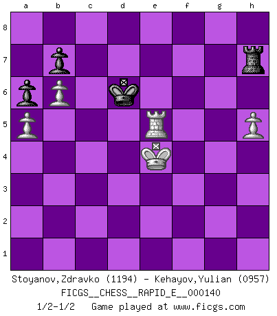 Last move : 1/2-1/2 2015 January 13 21:55:56 [Event "FICGS__CHESS__RAPID_E__000140"] [Site "FICGS"] [Date "2014.12.01"] [Round "1"] [White "Stoyanov,Zdravko"] [Black "Kehayov,Yulian"] [Result "1/2-1/2"] [WhiteElo "1194"] [BlackElo "0957"] 1.e4 e5 2.Nf3 d6 3.h3 Nf6 4.d3 Be7 5.Be2 O-O 6.a3 d5 7.exd5 Nxd5 8.c4 e4 9.dxe4 Nf6 10.O-O Nxe4 11.Nbd2 Nxd2 12.Qxd2 Qxd2 13.Bxd2 h6 14.Rfe1 Nc6 15.b4 Bf6 16.Rad1 Be6 17.b5 Nd4 18.Nxd4 Bxd4 19.Kf1 c6 20.Bxh6 Bxf2 21.Bxg7 Bxe1 22.Bxf8 Rxf8 23.Rxe1 cxb5 24.cxb5 Rd8 25.g4 Rd6 26.Bf3 Rd7 27.Kf2 Bc4 28.a4 a6 29.b6 Be6 30.Re5 Rd2+ 31.Ke3 Rd7 32.h4 Re7 33.g5 Kg7 34.h5 f6 35.gxf6+ Kxf6 36.Kf4 Rf7 37.Bd5 Bxd5 38.Rxd5 Ke6 39.Ke4 Rh7 40.Re5+ Kd6 41.Rd5+ Kc6 42.a5 Rh6 43.Kd4 Rh7 44.Rc5+ Kd6 45.Re5 Kc6 46.Rc5+ Kd6 47.Re5 Kc6 48.Ke4 Kd6 49.Kf4 Kc6 50.Ke4 Kd6 1/2-1/2 Philidor's defense Kingside Castling by player Black (move 5) Kingside Castling by player White (move 10) 10 pieces endgame at move 37 : White KRPPP , Black KRBPP WHITE : King + 1 Rook 3 Pawns BLACK : King + 1 Rook 1 Bishop 2 Pawns 9 pieces endgame at move 38 : White KRPPP , Black KRPP WHITE : King + 1 Rook 3 Pawns BLACK : King + 1 Rook 2 Pawns This chess game ended in a draw. Follow this game move after move (download)Methodical thinking is of more use in Chess than inspiration. (C. J. S. Purdy) Schon mancher Spieler hat aufgegeben, um zu vermeiden, daß er eine Figur verliert. (Savielly Grigorievitsch Tartakower) Los Peones son el alma de una partida de Ajedrez. (Francois Andre Danican Philidor) C'est la seule position que je connaisse où les deux camps sont mals. Propos prêtés à V. Anand. CHESS, n. f. [echecs, Fr.] A nice and abstruse game, in which two sets of puppets are moved in opposition to each other. (Dr Samuel Johnson, A Dictionary Of The English Language, 1755)