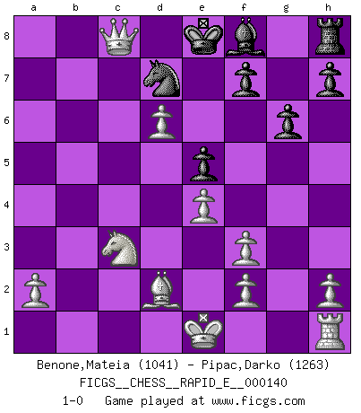 Last move : 1-0 2015 January 24 15:1:38 [Event "FICGS__CHESS__RAPID_E__000140"] [Site "FICGS"] [Date "2014.12.01"] [Round "1"] [White "Benone,Mateia"] [Black "Pipac,Darko"] [Result "1-0"] [WhiteElo "1041"] [BlackElo "1263"] 1.Nf3 d5 2.d4 Nc6 3.c4 Bg4 4.cxd5 Qxd5 5.Nc3 Qa5 6.e3 O-O-O 7.Bd2 Bxf3 8.gxf3 e5 9.d5 Nce7 10.e4 Qb6 11.Qa4 a6 12.Rc1 Qxb2 13.Rb1 b5 14.Qxa6+ Kd7 15.Rxb2 Nf6 16.Bxb5+ c6 17.Bxc6+ Nxc6 18.Qxc6+ Ke7 19.Rb7+ Rd7 20.Qc5+ Ke8 21.Rb8+ Rd8 22.Qc6+ Nd7 23.Rxd8+ Kxd8 24.d6 g6 25.Qc7+ Ke8 26.Qc8+ 1-0 Reti Opening Queenside Castling by player Black (move 6) Player White won this chess game. Follow this game move after move (download)There is no remorse like the remorse of Chess. (H. G. Wells) Ich verstehe Aljechins Kombinationen ganz gut; aber woher er diese Angriffschancen bekommt und wie er die Eröffnung behandelt das ist für mich ein Buch mit sieben Siegeln. (Rudolf Spielmann) El jugador blanco perdió porque fallo en recordar la coreccta continuación y tuvo que pensar por sí mismo las movidas. (Siegbert Tarrasch) Les échecs sont un jeu par leur forme, un art par leur essence et une science par sa difficulté d'acquisition. Ils peuvent vous procurer autant de plaisir qu'un bon livre ou une belle musique, mais vous n'aurez une réelle joie que si vous arrivez à bien jouer. (Tigran Petrosian) When you have everything, sometimes it feels like nothing. (Horatio Caine, C.S.I. Miami)