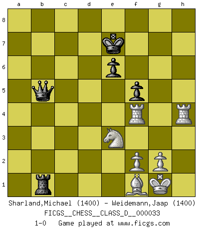 Last move : 1-0 2008 February 22 1:58:34 [Event "FICGS__CHESS__CLASS_D__000033"] [Site "FICGS"] [Date "2007.02.27"] [Round "1"] [White "Sharland,Michael"] [Black "Weidemann,Jaap"] [Result "1-0"] [WhiteElo "1400"] [BlackElo "1400"] 1.d4 Nf6 2.Nf3 d5 3.e3 e6 4.Bd3 c5 5.b3 Nc6 6.O-O Bd6 7.Bb2 O-O 8.c4 dxc4 9.bxc4 b6 10.Nc3 Bb7 11.Re1 Nb4 12.Be2 cxd4 13.exd4 Rc8 14.Nb5 Bxf3 15.Bxf3 Rxc4 16.Qb3 Rc8 17.Nxa7 Rc2 18.Ba3 Nfd5 19.Bxb4 Nxb4 20.Be4 Rd2 21.Nb5 h5 22.a3 Bxh2+ 23.Kxh2 Nd3 24.Qxd3 Rxd3 25.Bxd3 Qg5 26.Rac1 Qd2 27.Be2 h4 28.Rcd1 Qb2 29.Kg1 Rc8 30.Bf1 Rc2 31.Rb1 Qa2 32.Ra1 Qd5 33.Rac1 Rb2 34.Re3 g6 35.a4 Rb4 36.Ra3 g5 37.a5 bxa5 38.Rc5 Qe4 39.Rf3 Qe1 40.Rxg5+ Kf8 41.Nd6 Ke7 42.Re5 Qa1 43.Nf5+ Ke8 44.Ne3 Qxd4 45.Rxa5 Rb1 46.Ra8+ Ke7 47.Rc8 f5 48.Rc4 Qb2 49.Rxh4 Qb5 50.R3f4 1-0 This chess game has been lost on time (started : 2007.02.27 12:52:37) Queen's pawn game Kingside Castling by player White (move 6) Kingside Castling by player Black (move 7) Player White won this chess game. Follow this game move after move (download)The winner of the game is the player who makes the next-to-last mistake. (Savielly Tartakover) Das Schachspiel übertrifft alle anderen Spiele so weit wie der Chimborasso einen Misthaufen. (Arthur Schopenhauer) Tu sabes que vas a perder. Aún cuando tenía la ventaja, yo sabía que iba a perder. - al estar jugando con Fischer (Andrew Soltis) Ne tendez aucun piège pour le plaisir ! Ne jouez rien dans l'espoir que l'adversaire réagisse de façon stupide ! Prenez toujours pour acquis que l'adversaire va trouver le meilleur coup ! Ne jouez jamais de coup dans l'espoir que l'adversaire ne voie pas la menace ! Chacun de vos coups doit améliorer la position d'une façon ou d'une autre. It is a good thing for an uneducated man to read books of quotations. (Winston Churchill)