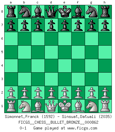 Last move : 0-1 2014 December 4 8:37:27 [Event "FICGS__CHESS__BULLET_BRONZE__000862"] [Site "FICGS"] [Date "2014.12.04"] [Round "1"] [White "Simonnet,Franck"] [Black "Sinsuat,Datuali"] [Result "0-1"] [WhiteElo "1592"] [BlackElo "2035"] 0-1 This chess game has been lost on time (started : 2014.12.04 3:21:58) Player Black won this chess game. Follow this game move after move (download)There just isn't enough televised Chess. (David Letterman) Ein Schachgenie ist jemand der verdammt gut Schach spielt. (Jonathan Levitt) Siempre es mejor sacrificar los hombres de tu oponente. (Savielly Tartakower) Le plus grand jeu de l'esprit jamais inventé, plus vous l'apprenez, plus vous y prenez du plaisir. (Garry Kasparov) At work, the authority of a person is inversely proportional to the number of pens that person is carrying. (Dan Rotaru)