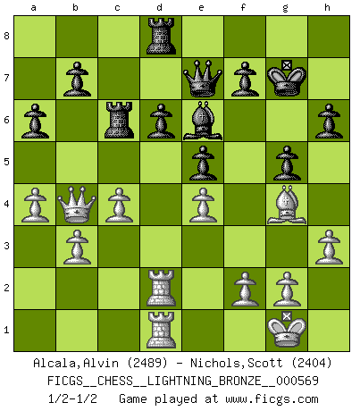 Last move : 1/2-1/2 2014 December 7 18:43:39 [Event "FICGS__CHESS__LIGHTNING_BRONZE__000569"] [Site "FICGS"] [Date "2014.12.07"] [Round "1"] [White "Alcala,Alvin"] [Black "Nichols,Scott"] [Result "1/2-1/2"] [WhiteElo "2489"] [BlackElo "2404"] 1.e4 c5 2.c4 Nc6 3.Ne2 g5 4.d4 cxd4 5.Nxd4 Bg7 6.Be3 Be5 7.Nc3 Nf6 8.Be2 d6 9.O-O h6 10.Nd5 O-O 11.Qd3 Nxd4 12.Bxd4 Bxd4 13.Qxd4 e5 14.Nxf6+ Qxf6 15.Qd3 Be6 16.b3 Rfd8 17.a4 Kg7 18.Ra2 a6 19.h3 Qf4 20.Rd1 Rac8 21.Rad2 Qf6 22.Qc3 Rc6 23.Qb4 Qe7 24.Bg4 1/2-1/2 Sicilian defense Kingside Castling by player White (move 9) Kingside Castling by player Black (move 10) This chess game ended in a draw. Follow this game move after move (download)The enormous mental resilience, without which no Chess player can exist, was so much taken up by Chess that he could never free his mind of this game. (Albert Einstein) Nie in meinem Leben habe ich die französische Verteidigung gespielt, welche die Stumpfsinnigste von allen ist. (Wilhelm Steinitz) No solamente yo pronostico su triunfo sobre Botvinnik, sino que me adelanto y digo que probablemente Fischer es el jugador de Ajedrez mas grande que haya existido. (John Collins) Votre seul travail dans les ouvertures est d'obtenir un milieu de partie jouable. (Lajos Portish) The beginning of wisdom is silence. The second step is listening. (Unknown)