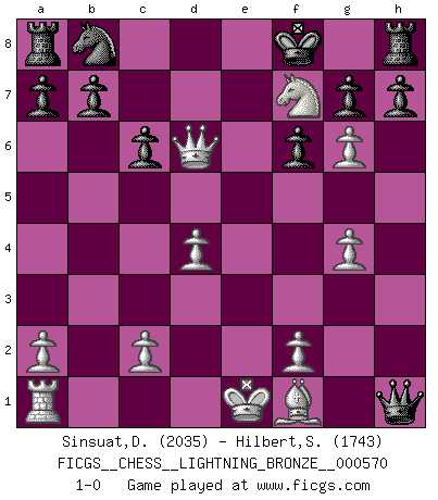 Last move : 1-0 2014 December 8 14:11:28 [Event "FICGS__CHESS__LIGHTNING_BRONZE__000570"] [Site "FICGS"] [Date "2014.12.08"] [Round "1"] [White "Sinsuat,Datuali"] [Black "Hilbert,Stephan J."] [Result "1-0"] [WhiteElo "2035"] [BlackElo "1743"] 1.e4 d5 2.exd5 Qxd5 3.Nc3 Qa5 4.d4 Nf6 5.Nf3 Bf5 6.Ne5 c6 7.Bf4 e6 8.g4 Bg6 9.h4 Bb4 10.Bd2 Ne4 11.h5 Nxc3 12.bxc3 Bxc3 13.hxg6 f6 14.Nf7 Bxd2+ 15.Qxd2 Qd5 16.Qe3 Qxh1 17.Qxe6+ Kf8 18.Qd6+ 1-0 Scandinavian defense Player White won this chess game. Follow this game move after move (download)Chess is a cold bath for the mind. (Sir John Simon) Rubinstein ist ein Turmendspiel, welches die Götter vor tausenden von Jahren begannen. (Savielly Grigorievitsch Tartakower) Haz el enroque temprano y seguido. (Rob Sillars) Le temps de noter son nom sur la feuille de partie, j'étais déjà en zeitnot ! D'un modeste amateur apparié lors de la première ronde d'un open contre le grand-maître Azmaïparashvili. Hardware: the parts of a computer that can be kicked. (Jeff Persis)