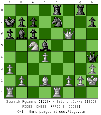 Last move : 0-1 2015 January 10 14:10:30 [Event "FICGS__CHESS__RAPID_B__000221"] [Site "FICGS"] [Date "2014.12.08"] [Round "1"] [White "Sternik,Ryszard"] [Black "Salonen,Jukka"] [Result "0-1"] [WhiteElo "1772"] [BlackElo "1877"] 1.e4 e5 2.Nf3 Nc6 3.Bb5 a6 4.Bxc6 dxc6 5.O-O f6 6.d4 Bg4 7.c3 Bd6 8.Be3 Qe7 9.Nbd2 O-O-O 10.Qc2 exd4 11.cxd4 Re8 12.e5 Bb4 13.h3 Be6 14.Ne4 Qf7 15.a3 Bb3 16.Qb1 Ba5 17.Nc5 Bd5 18.exf6 gxf6 19.Qf5+ Kb8 20.Qf4 Ka7 21.Bd2 Bb6 22.Rfe1 Ne7 23.Nh4 Rhg8 24.Kh2 Qh5 25.Qxf6 Qxh4 0-1 Ruy Lopez : Exchange, Gligoric variation Kingside Castling by player White (move 5) Queenside Castling by player Black (move 9) Player Black won this chess game. Follow this game move after move (download)Half the variations which are calculated in a tournament game turn out to be completely superfluous. Unfortunately, no one knows in advance which half. (Jan Tinman) Eine Person mit durchschnittlichem IQ kann etwa eine ELO von 2000 erreichen. (Jonathan Levitt) No es suficiente ser un buen jugador, se debe también de jugar bién. (Siegbert Tarrasch) Pour moi, les échecs ne sont pas un jeu mais un art. (Alexandre Alekhine) Yoga is 99% practice and 1% knowledge. (Sri Krishna Pattabhi Jois)